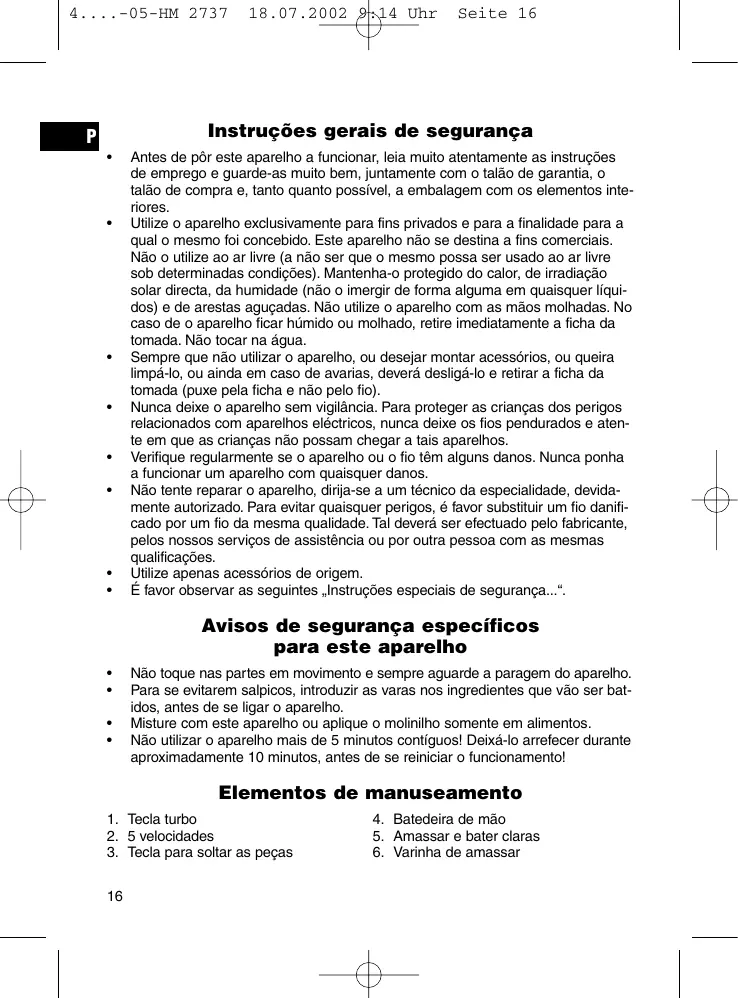 Não toque nas partes em movimento e sempre aguarde a paragem do aparelho. Para se evitarem salpicos, introduzir as varas nos ingredientes que vão ser batidos, antes de se ligar o aparelho. Misture com este aparelho ou aplique o molinilho somente em alimentos. Não utilizar o aparelho mais de 5 minutos contíguos! Deixá-lo arrefecer durante aproximadamente 10 minutos, antes de se reiniciar o funcionamento! Elementos de manuseamento