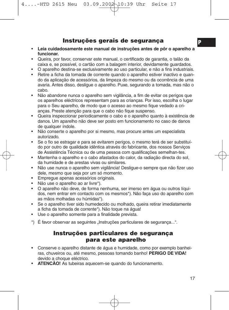 Leia cuidadosamente este manual de instruções antes de pôr o aparelho a funcionar. Queira, por favor, conservar este manual, o certificado de garantia, o talão da caixa e, se possível, o cartão com a balagem interior, devidamente guardados. O aparelho destina-se exclusivamente ao uso particular, e não a fins industriais. Retire a ficha da tomada de corrente quando o aparelho estiver inactivo e quando da aplicação de acessórios, da limpeza do mesmo ou da ocorrência de uma avaria. Antes disso, desligue o aparelho. Puxe, segurando a tomada, mas não o cabo. Não abandone nunca o aparelho sem vigilância, a fim de evitar os perigos que os aparelhos eléctricos representam para as crianças. Por isso, escolha o lugar para o Seu aparelho, de modo que o acesso ao mesmo fique vedado a crianças. Preste atenção para que o cabo não fique suspenso. Queira inspeccionar periodicamente o cabo e o aparelho quanto à existência de danos. Um aparelho não deve ser posto em funcionamento no caso de danos de qualquer índole. Não conserte o aparelho por si mesmo, mas procure antes um especialista autorizado. Se o fio se estragar e para se evitarem perigos, o mesmo terá de ser substituído por outro de qualidade idêntica através do fabricante, dos nossos Serviços de Assistência Técnica ou de uma pessoa com qualificações semelhan-tes. Mantenha o aparelho e o cabo afastados do calor, da radiação directa do sol, da humidade e de arestas vivas ou similares. Não use nunca o aparelho sem vigilância! Desligue-o sempre que não fizer uso dele, mesmo que seja por um só momento. Empregue apenas acessórios originais. Não use o aparelho ao ar livre*). O aparelho não deve, de forma nenhuma, ser imerso em água ou outros líquidos, nem entrar em contacto com os mesmos*). Não faça uso do aparelho com as mãos molhadas ou húmidas*). Se o aparelho tiver sido humedecido ou molhado, queira retirar imediatamente a ficha da tomada de corrente*). Não toque na água! Use o aparelho somente para a finalidade prevista. *) É favor observar as seguintes „Instruções particulares de segurança...“. Instruções particulares de segurança para este aparelho
