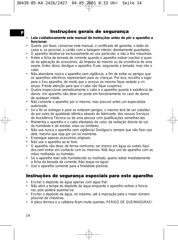 Leia cuidadosamente este manual de instruções antes de pôr o aparelho a funcionar. Queira, por favor, conservar este manual, o certificado de garantia, o talão da caixa e, se possível, o cartão com a balagem interior, devidamente guardados. O aparelho destina-se exclusivamente ao uso particular, e não a fins industriais. Retire a ficha da tomada de corrente quando o aparelho estiver inactivo e quando da aplicação de acessórios, da limpeza do mesmo ou da ocorrência de uma avaria. Antes disso, desligue o aparelho. Puxe, segurando a tomada, mas não o cabo. Não abandone nunca o aparelho sem vigilância, a fim de evitar os perigos que os aparelhos eléctricos representam para as crianças. Por isso, escolha o lugar para o Seu aparelho, de modo que o acesso ao mesmo fique vedado a crianças. Preste atenção para que o cabo não fique suspenso. Queira inspeccionar periodicamente o cabo e o aparelho quanto à existência de danos. Um aparelho não deve ser posto em funcionamento no caso de danos de qualquer índole. Não conserte o aparelho por si mesmo, mas procure antes um especialista autorizado. Se o fio se estragar e para se evitarem perigos, o mesmo terá de ser substituído por outro de qualidade idêntica através do fabricante, dos nossos Serviços de Assistência Técnica ou de uma pessoa com qualificações semelhan-tes. Mantenha o aparelho e o cabo afastados do calor, da radiação directa do sol, da humidade e de arestas vivas ou similares. Não use nunca o aparelho sem vigilância! Desligue-o sempre que não fizer uso dele, mesmo que seja por um só momento. Empregue apenas acessórios originais. Não use o aparelho ao ar livre. O aparelho não deve, de forma nenhuma, ser imerso em água ou outros líquidos,nem entrar em contacto com os mesmos. Não faça uso do aparelho com as mãos molhadas ou húmidas. Se o aparelho tiver sido humedecido ou molhado, queira retirar imediatamente a ficha da tomada de corrente. Não toque na água! Use o aparelho somente para a finalidade prevista.