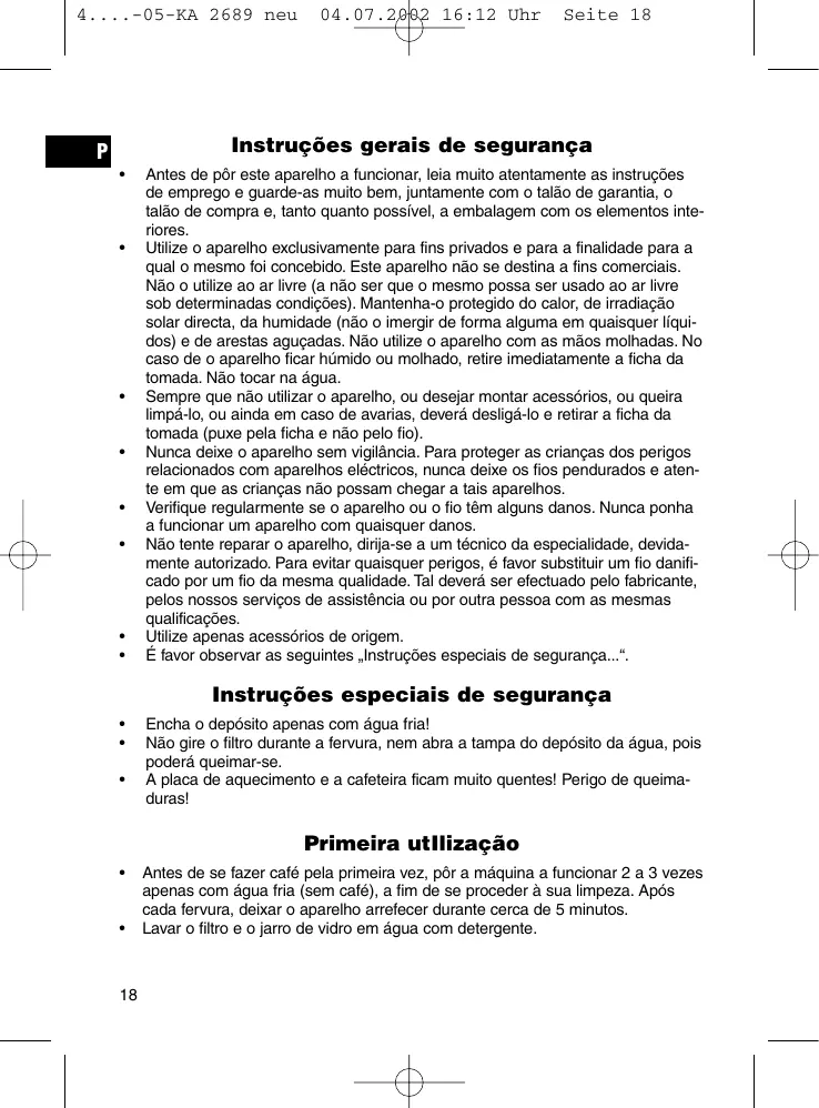 Antes de se fazer café pela primeira vez, pôr a máquina a funcionar 2 a 3 vezes apenas com água fria (sem café), a fim de se proceder à sua limpeza. Após cada fervura, deixar o aparelho arrefecer durante cerca de 5 minutos. Lavar o filtro e o jarro de vidro em água com detergente.