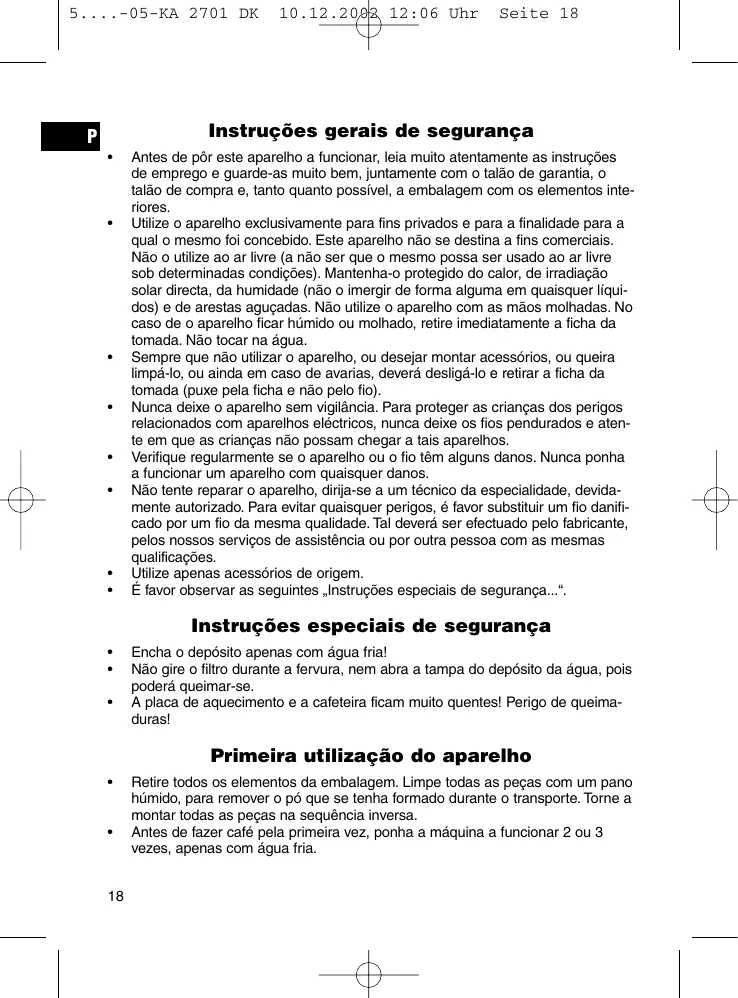 Antes de pôr este aparelho a funcionar, leia muito atentamente as instruções de emprego e guarde-as muito bem, juntamente com o talão de garantia, o talão de compra e, tanto quanto possível, a embalagem com os elementos interiores. Utilize o aparelho exclusivamente para fins privados e para a finalidade para a qual o mesmo foi concebido. Este aparelho não se destina a fins comerciais. Não o utilize ao ar livre (a não ser que o mesmo possa ser usado ao ar livre sob determinadas condições). Mantenha-o protegido do calor, de irradiação solar directa, da humidade (não o imergir de forma alguma em quaisquer líquidos) e de arestas aguçadas. Não utilize o aparelho com as mãos molhadas. No caso de o aparelho ficar húmido ou molhado, retire imediatamente a ficha da tomada. Não tocar na água. Sempre que não utilizar o aparelho, ou desejar montar acessórios, ou queira limpá-lo, ou ainda em caso de avarias, deverá desligá-lo e retirar a ficha da tomada (puxe pela ficha e não pelo fio). Nunca deixe o aparelho sem vigilância. Para proteger as crianças dos perigos relacionados com aparelhos eléctricos, nunca deixe os fios pendurados e atente em que as crianças não possam chegar a tais aparelhos. Verifique regularmente se o aparelho ou o fio têm alguns danos. Nunca ponha a funcionar um aparelho com quaisquer danos. Não tente reparar o aparelho, dirija-se a um técnico da especialidade, devidamente autorizado. Para evitar quaisquer perigos, é favor substituir um fio danificado por um fio da mesma qualidade. Tal deverá ser efectuado pelo fabricante, pelos nossos serviços de assistência ou por outra pessoa com as mesmas qualificações. Utilize apenas acessórios de origem. É favor observar as seguintes „Instruções especiais de segurança...“.