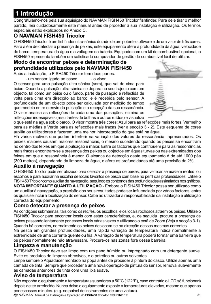 1 Introdução Congratulamo-nos pela sua aquisição do NAVMAN FISH450 Tricolor fishfinder. Para dele tirar o melhor partido, leia cuidadosamente este manual antes de proceder à sua instalação e utilização. Os termos especiais estão explicados no Anexo C.