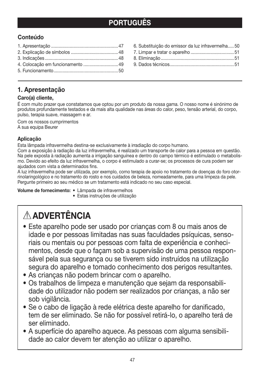 • Esta lâmpada infravermelha destina-se exclusivamente à irradiação do corpo humano. • Antes da utilização, assegure-se de que o aparelho e os acessórios não apresentam quaisquer danos e de que todos os materiais de embalagem foram retirados. Em caso de dúvida, não o utilize e dirija-se ao seu distribuidor ou ao endereço do apoio ao cliente. • Verifique sempre se o aparelho está bem assente, sem abanar. • O corpo da lâmpada e a própria lâmpada infravermelha aquecem muito durante o funcionamento. No caso de contacto, existe perigo de queimadura! Deixar arrefecer a lâmpada antes de tocar nela • A distância mínima entre objectos inflamáveis e o emissor da luz infravermelha, que de resto deve ser cumprida, é de 1,0 m. Não pendure o aparelho na parede ou no tecto. • O aparelho só pode ser conectado à tensão de rede indicada na placa de modelo. • Não submerja o aparelho em água nem o utilize em recintos molhados. • Este aparelho não se destina a ser usado por pessoas (incluindo crianças) com capacidades psíquicas, sensoriais ou mentais limitadas ou que não disponham da experiência e/ou conhecimentos necessários à sua utilização, a não ser que sejam vigiadas por uma pessoa responsável pela sua segurança ou que tenham recebido instruções dessa pessoa sobre a utilização correcta do aparelho. As crianças devem ser vigiadas, por forma a evitar que brinquem com o aparelho. • Não usar em pessoas insensíveis ao calor. A sensação de calor pode estar limitada ou intensivada nos seguintes casos: – em doentes diabéticos, – em pessoas com sonolência, demência ou dificuldades de concentração, – em pessoas com áreas cicatrizadas na região que se pretende tratar, – em pessoas com alergias, – em crianças ou pessoas idosas, – após a ingestão de medicamentos ou álcool. • Na presença de processos inflamáveis agudos, só se deve realizar uma radiação depois de consultar o médico. 48