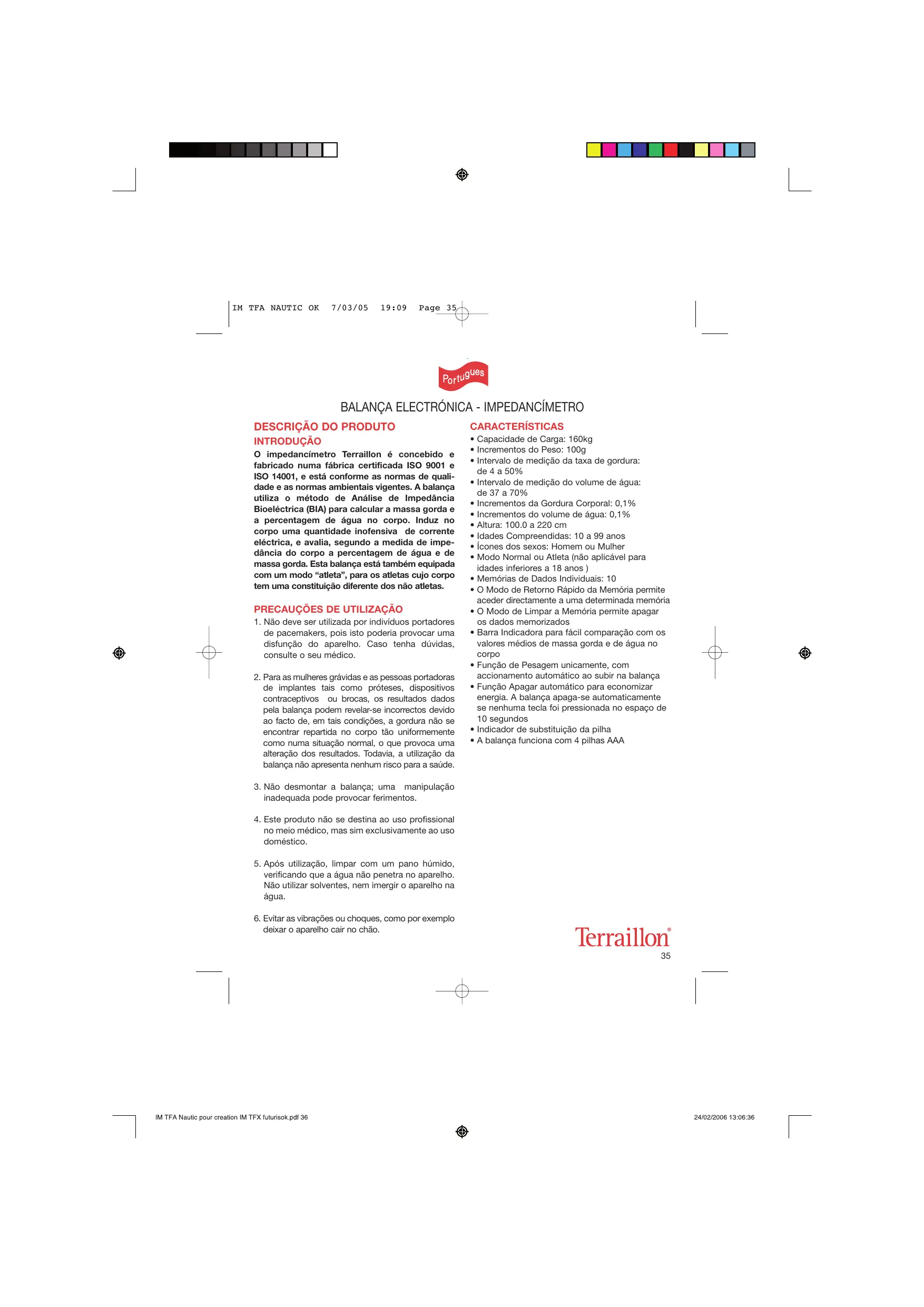 • A balança funciona com 4 pilhas AAA O impedancímetro Terraillon é concebido e fabricado numa fábrica certificada ISO 9001 e ISO 14001, e está conforme as normas de qualidade e as normas ambientais vigentes. A balança utiliza o método de Análise de Impedância Bioeléctrica (BIA) para calcular a massa gorda e a percentagem de água no corpo. Induz no corpo uma quantidade inofensiva de corrente eléctrica, e avalia, segundo a medida de impedância do corpo a percentagem de água e de massa gorda. Esta balança está também equipada com um modo “atleta”, para os atletas cujo corpo tem uma constituição diferente dos não atletas.