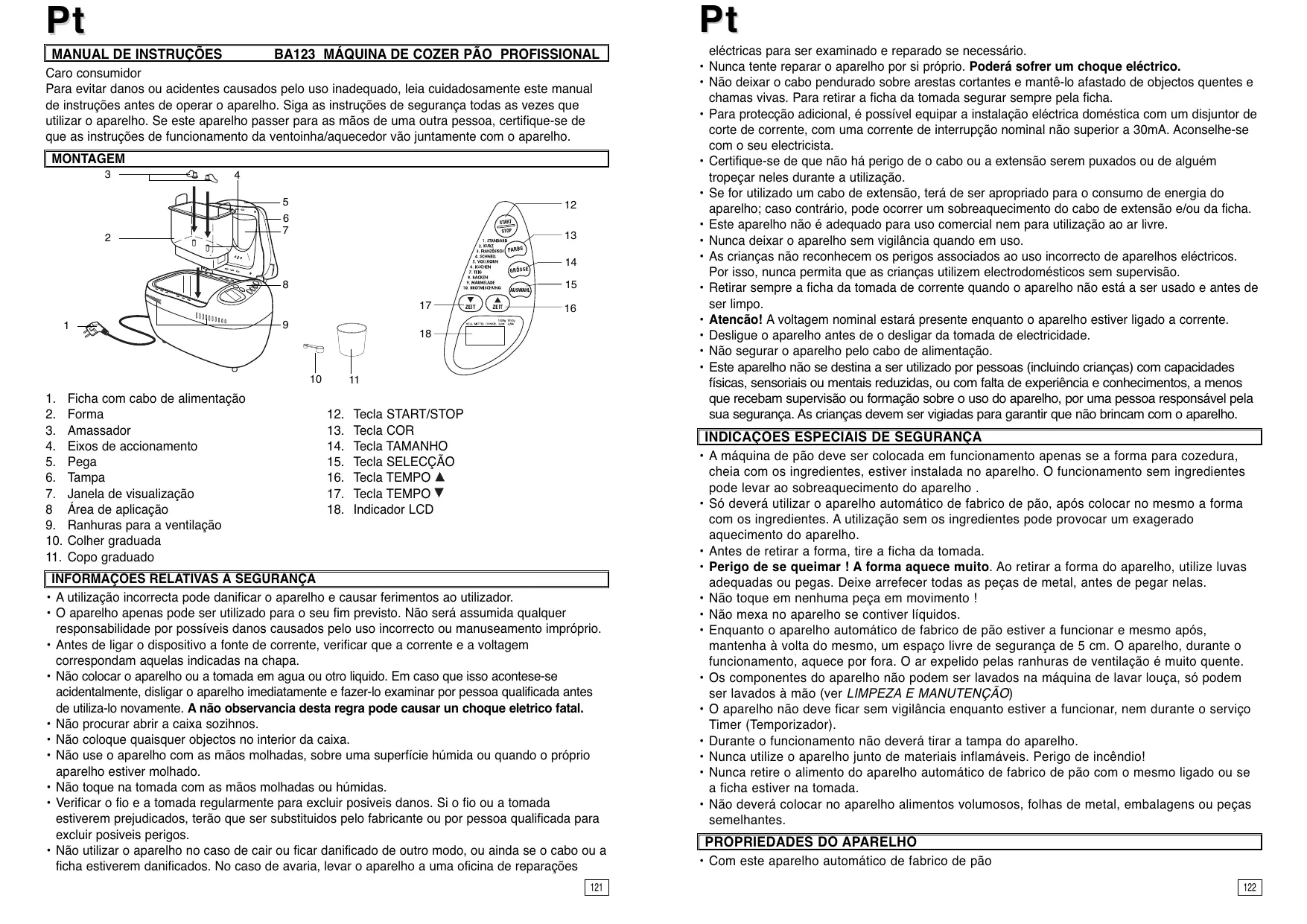 BA123 MÁQUINA DE COZER PÃO PROFISSIONAL Caro consumidor Para evitar danos ou acidentes causados pelo uso inadequado, leia cuidadosamente este manual de instruções antes de operar o aparelho. Siga as instruções de segurança todas as vezes que utilizar o aparelho. Se este aparelho passer para as mãos de uma outra pessoa, certifique-se de que as instruções de funcionamento da ventoinha/aquecedor vão juntamente com o aparelho. MONTAGEM