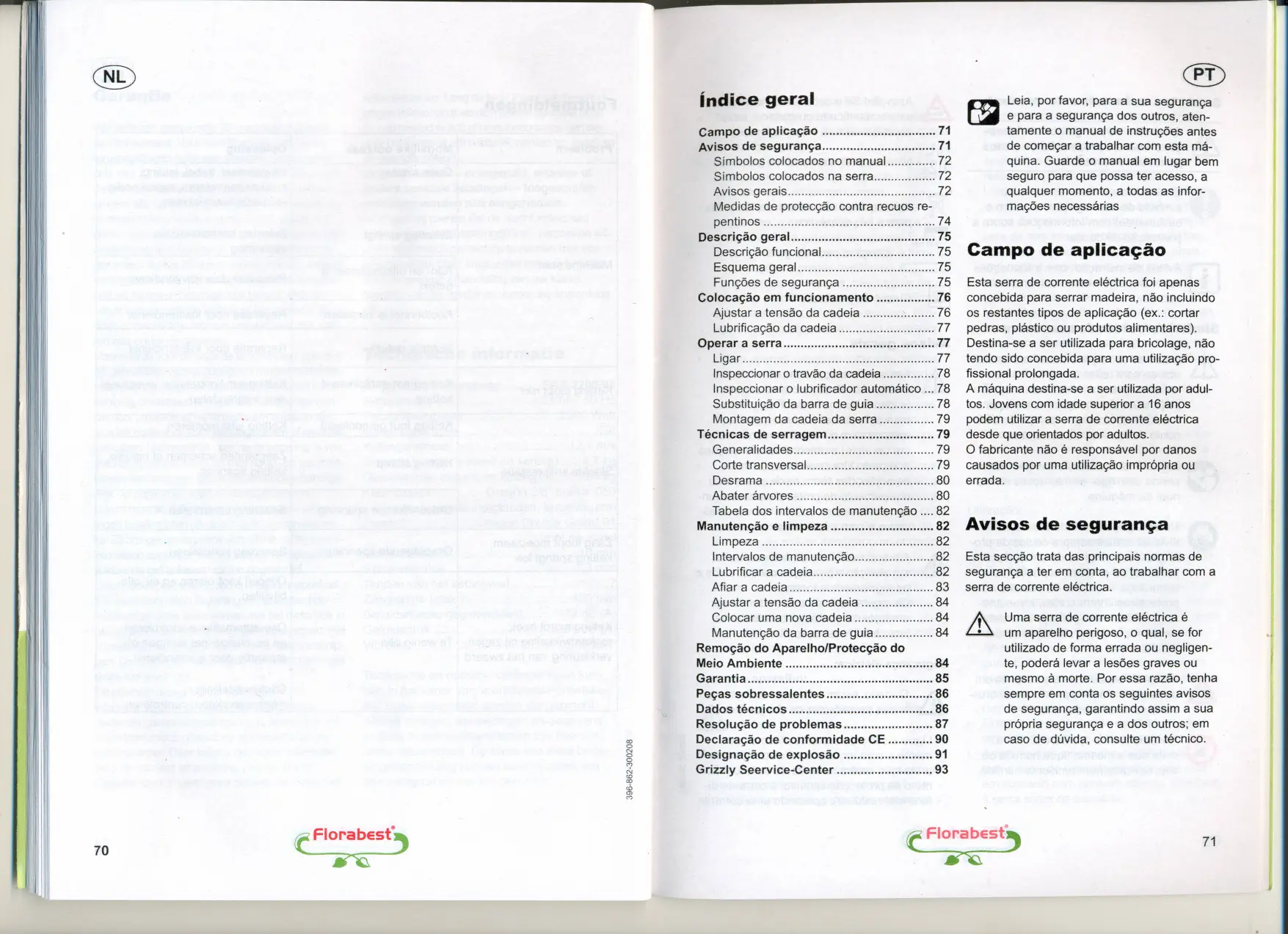 Leia, por favor, para a sua seguranya e para a seguranya dos outros, atentamente 0 manual de instrucöes antes de cornecar a trabalhar com esta rnaquina. Guarde 0 manual em lugar bem seguro para que possa ter acesso, a qualquer momento, a todas as inforrnacöes necessarias Campo de aplica.;äo Esta serra de corrente electrica foi apenas concebida para serrar madeira, näo incluindo os restantes tipos de aptlcacäo (ex.: cortar pedras, plastico ou produtos alimentares). Destina-se a ser utilizada para bricolage, näo tendo sido concebida para uma utilizacäo profissional prolongada. A rnaquina destina-se a ser utilizada por adultos. Jovens com idade superior a 16 anos podem utilizar a serra de corrente electnca desde que orientados por adultos. o fabricante näo e responsavel por danos causados por uma utlllzacäo impr6pria ou errada. Avisos de seguran.;a Esta seccäo trata das principais normas de sequranca a ter em conta, ao trabalhar com a serra de corrente electrica. Florabest,
