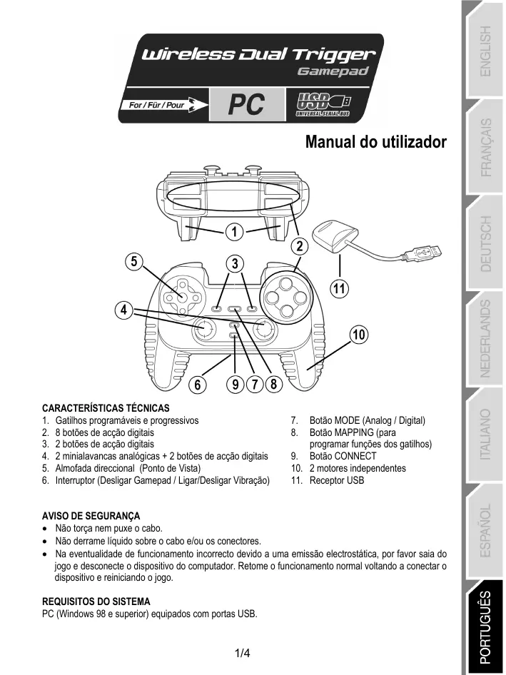 CARACTERÍSTICAS TÉCNICAS 1. Gatilhos programáveis e progressivos 2. 8 botões de acção digitais 3. 2 botões de acção digitais 4. 2 minialavancas analógicas + 2 botões de acção digitais 5. Almofada direccional (Ponto de Vista) 6. Interruptor (Desligar Gamepad / Ligar/Desligar Vibração)