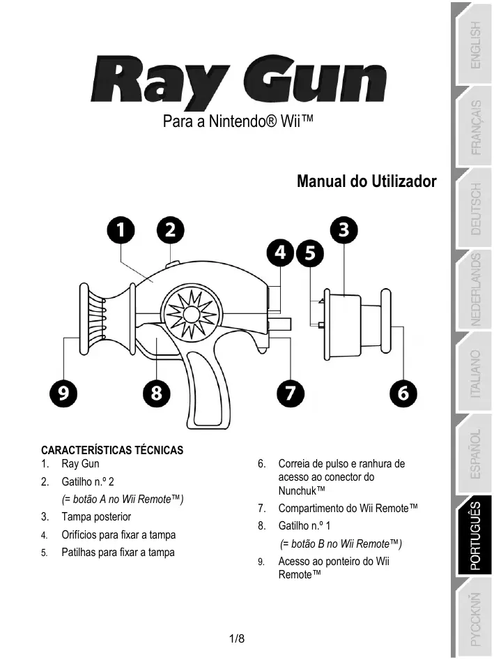 SISTEMA DE DOIS GATILHOS O primeiro gatilho (8): - corresponde ao botão “B” situado na face posterior do Wii Remote™, - é facilmente acessível por meio do dedo indicador, - é utilizado geralmente na função de disparo. O segundo gatilho (2): - possui um mecanismo que prime o botão “A” situado na face superior do Wii Remote™, - está situado no cimo da Ray Gun e é facilmente acessível com a outra mão, - é utilizado geralmente em funções diversas, como recarregar, segunda arma, saltar ou outras. Nota: - Para alterar as funções atribuídas aos gatilhos, vá ao menu das opções do controlador no jogo e seleccione as funções que pretende atribuir aos botões “A” e “B” do Wii Remote™.