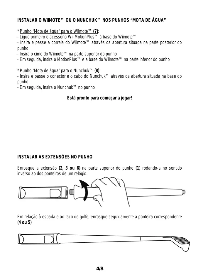 INSTALAR O WIIMOTE™ OU O NUNCHUK™ NOS PUNHOS “MOTA DE ÁGUA” * Punho “Mota de água” para o Wiimote™ (7): - Ligue primeiro o acessório Wii MotionPlus™ à base do Wiimote™ - Insira e passe a correia do Wiimote™ através da abertura situada na parte posterior do punho - Insira o cimo do Wiimote™ na parte superior do punho - Em seguida, insira o MotionPlus™ e a base do Wiimote™ na parte inferior do punho * Punho “Mota de água” para o Nunchuk™ (8): - Insira e passe o conector e o cabo do Nunchuk™ através da abertura situada na base do punho - Em seguida, insira o Nunchuk™ no punho Está pronto para começar a jogar!