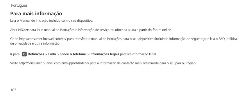 Português Para mais informação Leia o Manual de Iniciação incluído com o seu dispositivo. Abrir HiCare para ler o manual de instruções e informação de serviço ou obtenha ajuda a partir do fórum online. Go to http://consumer.huawei.com/en/ para transferir o manual de instruções para o seu dispositivo (incluindo informação de segurança) e leia o FAQ, política de privacidade e outra informação. Ir para Definições > Tudo > Sobre o telefone > Informações legais para ler informação legal. Visite http://consumer.huawei.com/en/support/hotline/ para a informação de contacto mais actualizada para o seu país ou região.