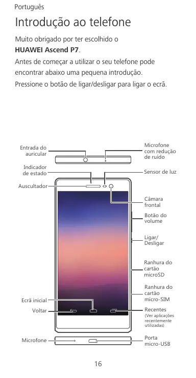 Português Introdução ao telefone Muito obrigado por ter escolhido o HUAWEI Ascend P7. Antes de começar a utilizar o seu telefone pode encontrar abaixo uma pequena introdução. Pressione o botão de ligar/desligar para ligar o ecrã. +TZXGJGJU