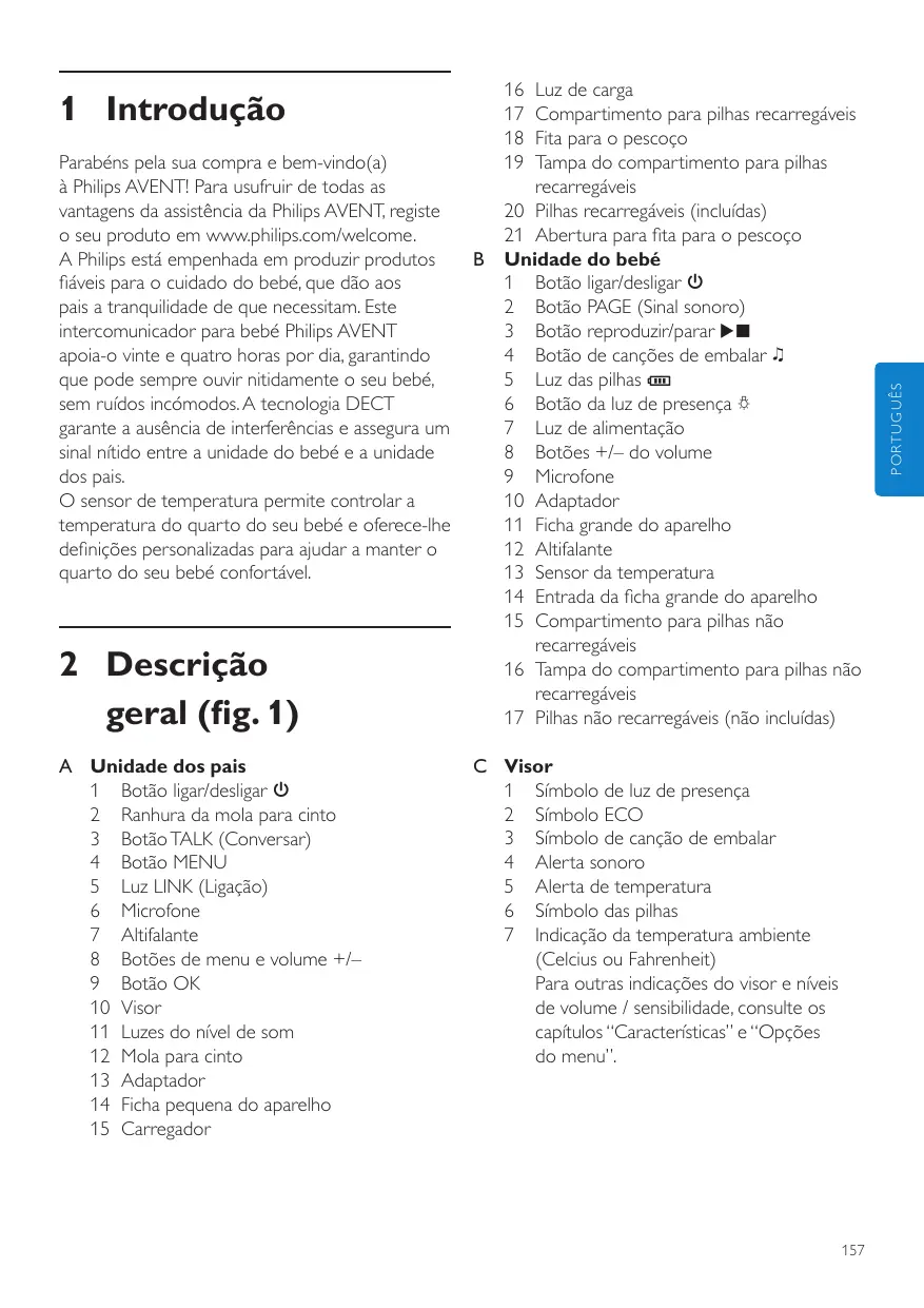 - • Det kan ta et par minutter før batterisymbolet vises på displayet på foreldreenheten når du lader foreldreenheten for første gang, eller hvis det er lenge siden enheten har vært i bruk. Parabéns pela sua compra e bem-vindo(a) à Philips AVENT! Para usufruir de todas as vantagens da assistência da Philips AVENT, registe o seu produto em www.philips.com/welcome. A Philips está empenhada em produzir produtos fiáveis para o cuidado do bebé, que dão aos pais a tranquilidade de que necessitam. Este intercomunicador para bebé Philips AVENT apoia-o vinte e quatro horas por dia, garantindo que pode sempre ouvir nitidamente o seu bebé, sem ruídos incómodos. A tecnologia DECT garante a ausência de interferências e assegura um sinal nítido entre a unidade do bebé e a unidade dos pais. O sensor de temperatura permite controlar a temperatura do quarto do seu bebé e oferece-lhe definições personalizadas para ajudar a manter o quarto do seu bebé confortável. 2 Descrição geral (fig. 1) A Unidade dos pais 1 Botão ligar/desligar 3 2 Ranhura da mola para cinto 3 Botão TALK (Conversar) 4 Botão MENU 5 Luz LINK (Ligação) 6 Microfone 7 Altifalante 8 Botões de menu e volume +/– 9 Botão OK 10 Visor 11 Luzes do nível de som 12 Mola para cinto 13 Adaptador 14 Ficha pequena do aparelho 15 Carregador