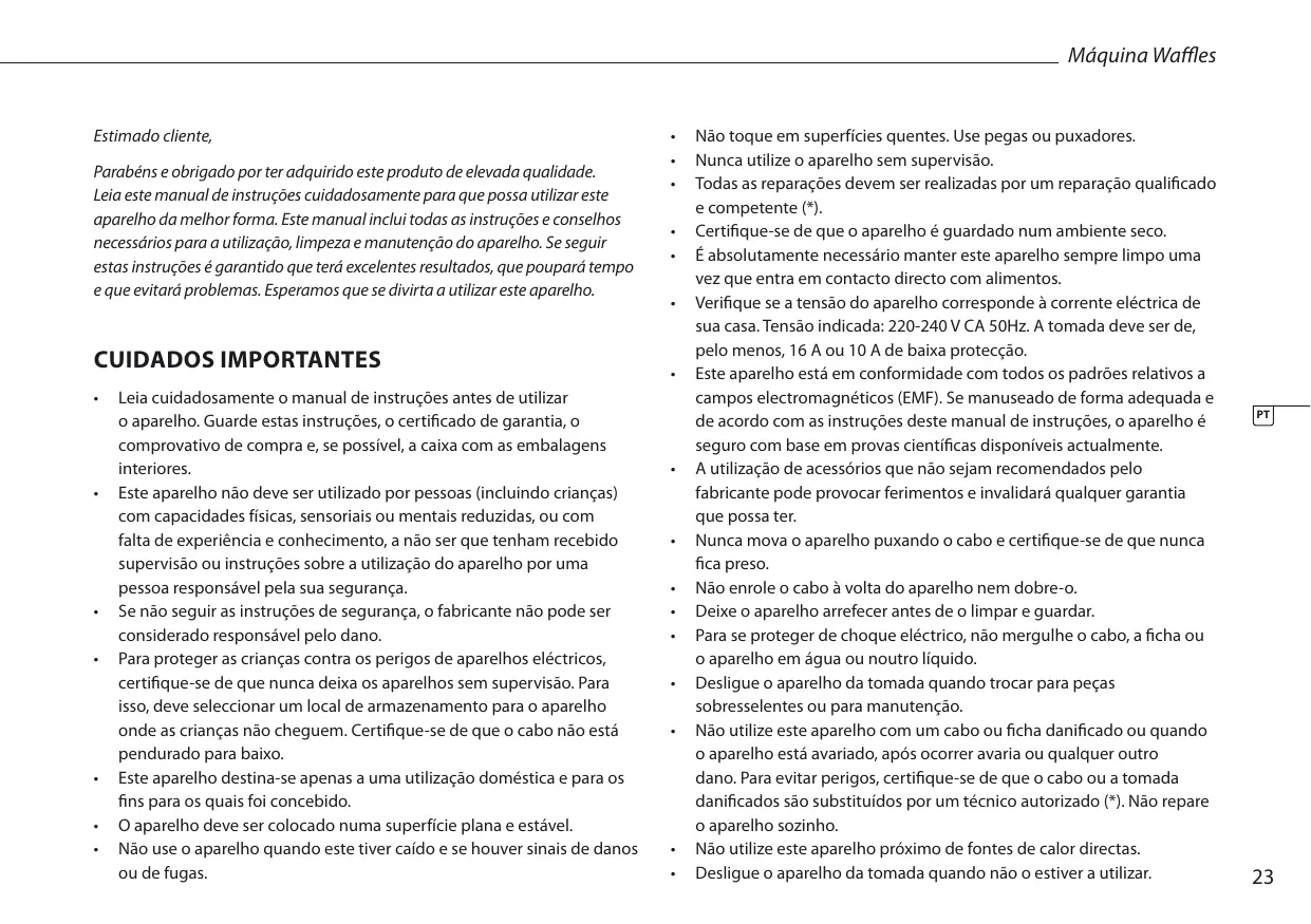 - Nunca use água ou outras tipo de liquido no marcador de waffle, não o mergulhe.