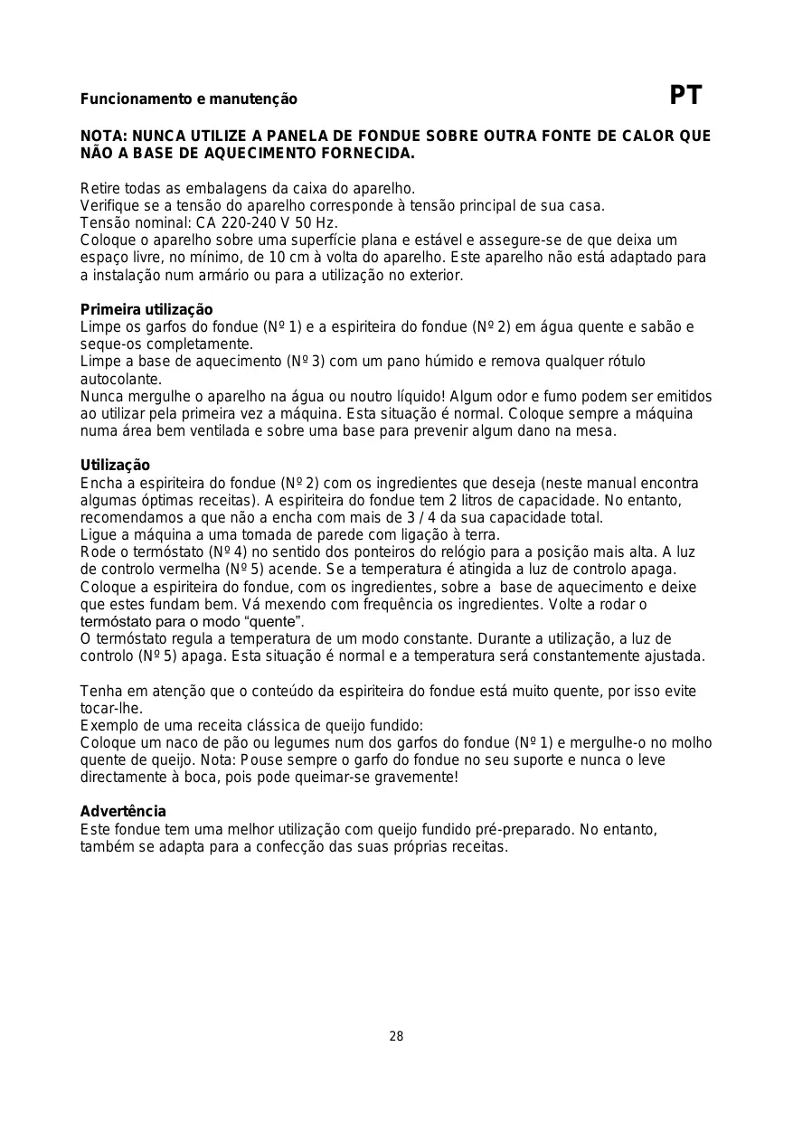 Encha a espiriteira do fondue (N° 2) com os ingredientes que deseja (neste manual encontrar algumas óptimas receitas). A espiriteira do fondue tem 2litros de capacité. No entanto, recomendamos a que não a enchava com mais de 3 / 4 da sua capacité total.