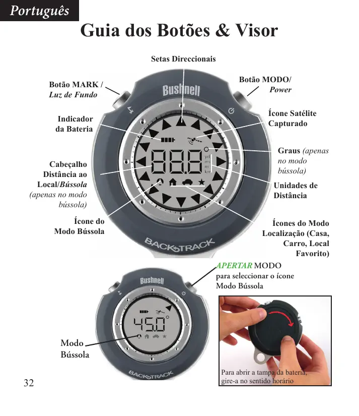 Português Como usar seu Bushnell BackTrack Tecla de botão de operação: “APERTAR”= aperte brevemente e solte o botão “SEGURAR”= mantenha o botão pressionado (não solte) por 2 segundos