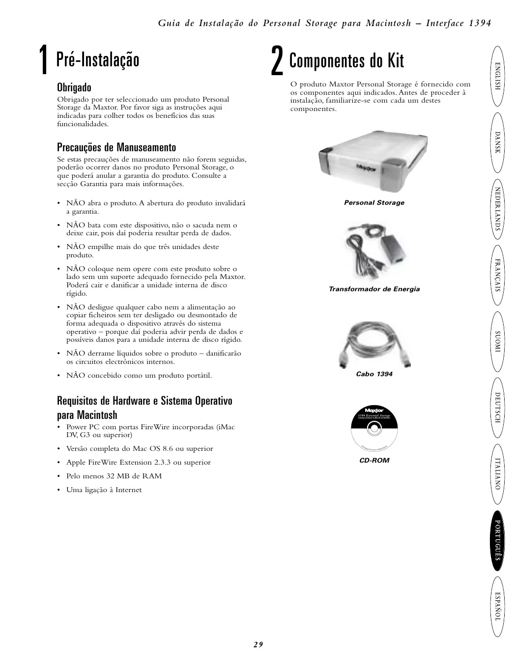Guia de Instalação do Personal Storage para Macintosh – Interface 1394 2 Componentes do Kit O produto Maxtor Personal Storage é fornecido com os componentes aqui indicados. Antes de proceder à instalação, familiarize-se com cada um destes componentes. Obrigado Obrigado por ter seleccionado um produto Personal Storage da Maxtor. Por favor siga as instruções aqui indicadas para colher todos os benefícios das suas funcionalidades. ENGLISH 1 Pré-Instalação DANSK Precauções de Manuseamento Personal Storage