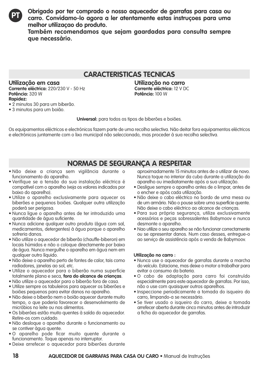 Obrigado por ter comprado o nosso aquecedor de garrafas para casa ou carro. Convidamo-lo agora a ler atentamente estas instruçoes para uma melhor utilizaçao do produto. Também recomendamos que sejam gaardadas para consulta sempre que necessàrio. CARACTERISTICAS TECNICAS Utilização em casa Utilização no carro Corrente eléctrica: 220/230 V - 50 Hz Potência: 320 W Rapidez: