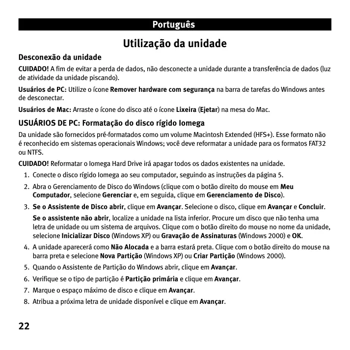 Utilização da unidade Desconexão da unidade CUIDADO! A fim de evitar a perda de dados, não desconecte a unidade durante a transferência de dados (luz de atividade da unidade piscando). Usuários de PC: Utilize o ícone Remover hardware com segurança na barra de tarefas do Windows antes de desconectar. Usuários de Mac: Arraste o ícone do disco até o ícone Lixeira (Ejetar) na mesa do Mac. USUÁRIOS DE PC: Formatação do disco rígido Iomega Da unidade são fornecidos pré-formatados como um volume Macintosh Extended (HFS+). Esse formato não é reconhecido em sistemas operacionais Windows; você deve reformatar a unidade para os formatos FAT32 ou NTFS. CUIDADO! Reformatar o Iomega Hard Drive irá apagar todos os dados existentes na unidade.