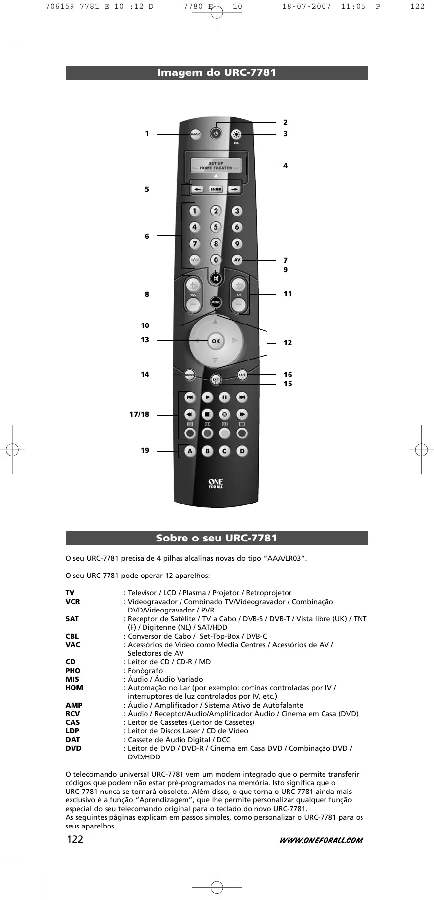 Encontre gratuitamente o manual do aparelho URC 7781 ONEFORALL em formato PDF.