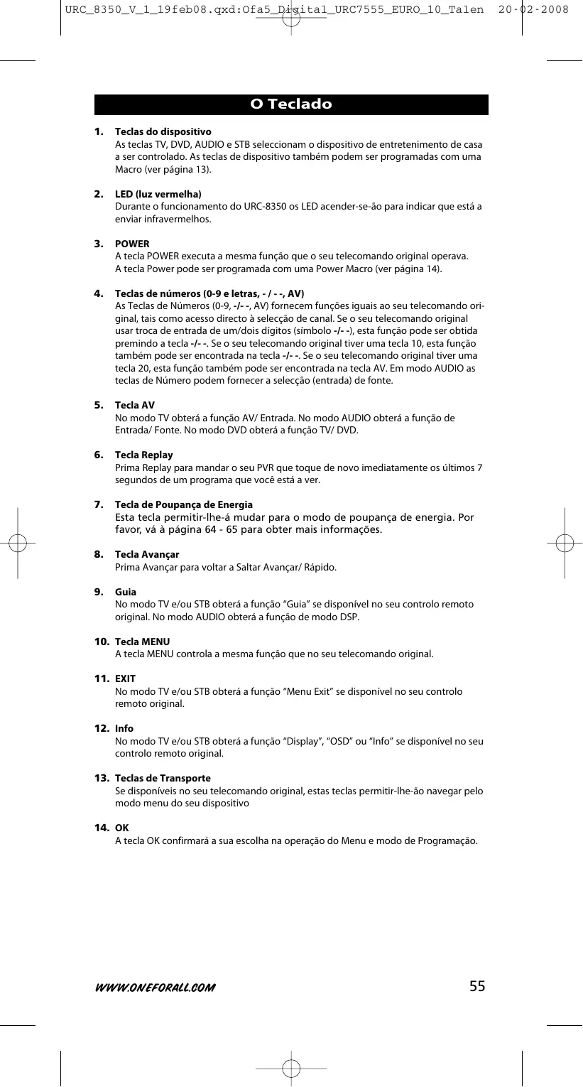 Encontre gratuitamente o manual do aparelho URC 8350 ONEFORALL em formato PDF.