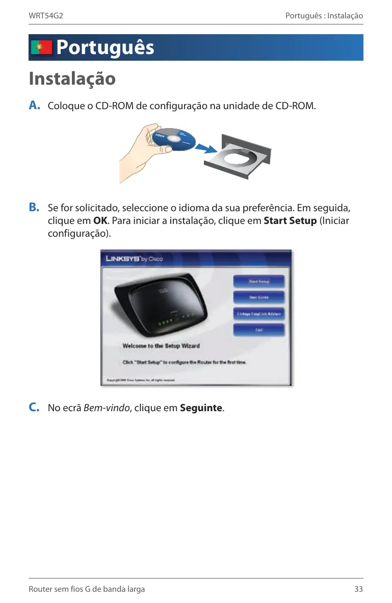 Wireless-G Breedbandrouter WRT54G2 Português : Instalação Português Instalação A. Coloque o CD-ROM de configuração na unidade de CD-ROM. B. Se for solicitado, seleccione o idioma da sua preferência. Em seguida, clique em OK. Para iniciar a instalação, clique em Start Setup (Iniciar configuração). C. No ecrã Bem-vindo, clique em Seguinte. Router sem fios G de banda larga