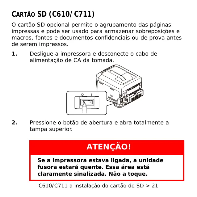 Pressione o botão de abertura e abra totalmente a tampa superior. ATENÇÃO! Se a impressora estava ligada, a unidade fusora estará quente. Essa área está claramente sinalizada. Não a toque. C610/C711 a instalação do cartão do SD > 21