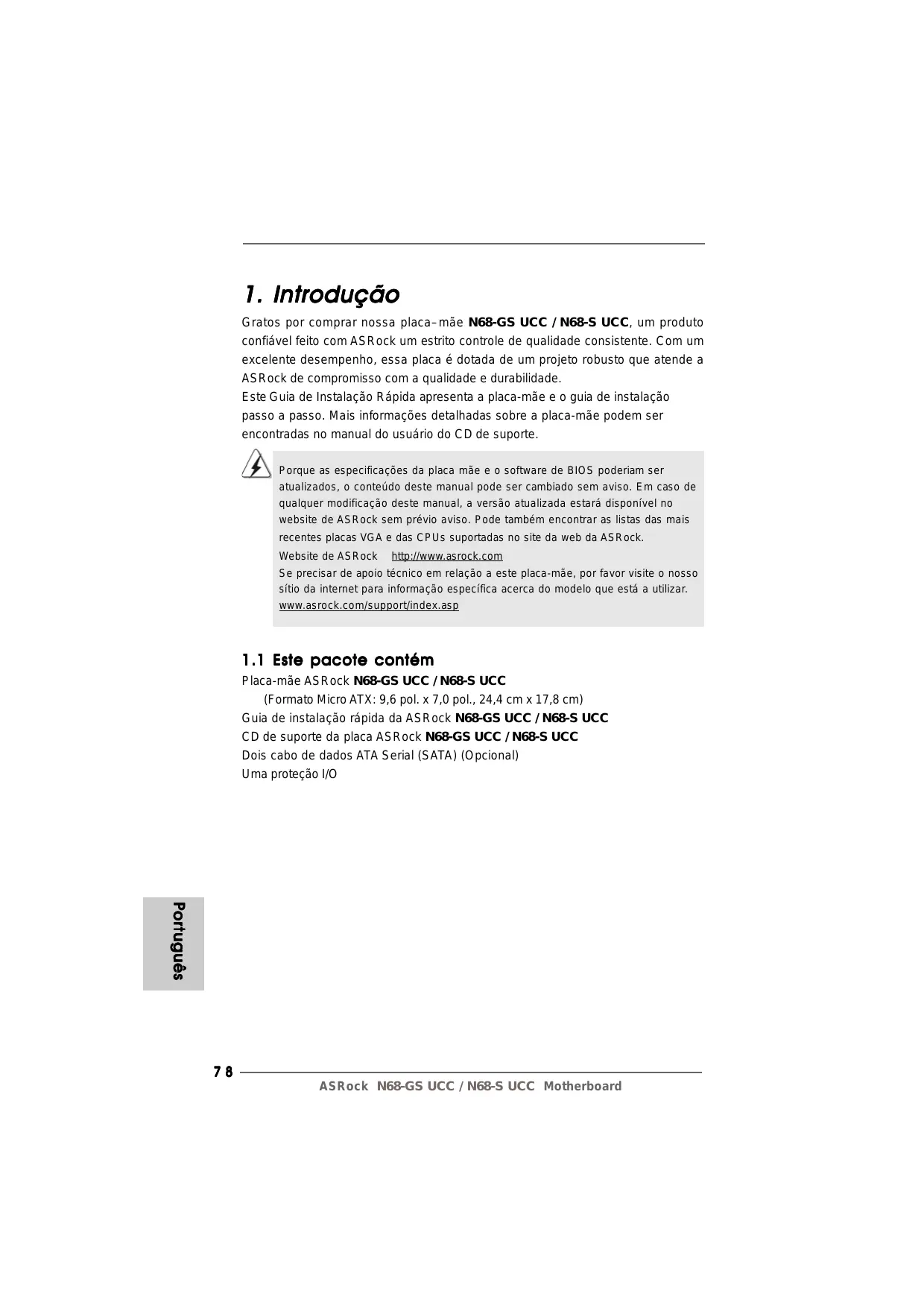 Gratos por comprar nossa placa–mãe N68-GS UCC / N68-S UCC, um produto confiável feito com ASRock um estrito controle de qualidade consistente. Com um excelente desempenho, essa placa é dotada de um projeto robusto que atende a ASRock de compromisso com a qualidade e durabilidade. Este Guia de Instalação Rápida apresenta a placa-mãe e o guia de instalação passo a passo. Mais informações detalhadas sobre a placa-mãe podem ser encontradas no manual do usuário do CD de suporte. Porque as especificações da placa mãe e o software de BIOS poderiam ser atualizados, o conteúdo deste manual pode ser cambiado sem aviso. Em caso de qualquer modificação deste manual, a versão atualizada estará disponível no website de ASRock sem prévio aviso. Pode também encontrar as listas das mais recentes placas VGA e das CPUs suportadas no site da web da ASRock. Website de ASRock http://www.asrock.com Se precisar de apoio técnico em relação a este placa-mãe, por favor visite o nosso sítio da internet para informação específica acerca do modelo que está a utilizar. www.asrock.com/support/index.asp