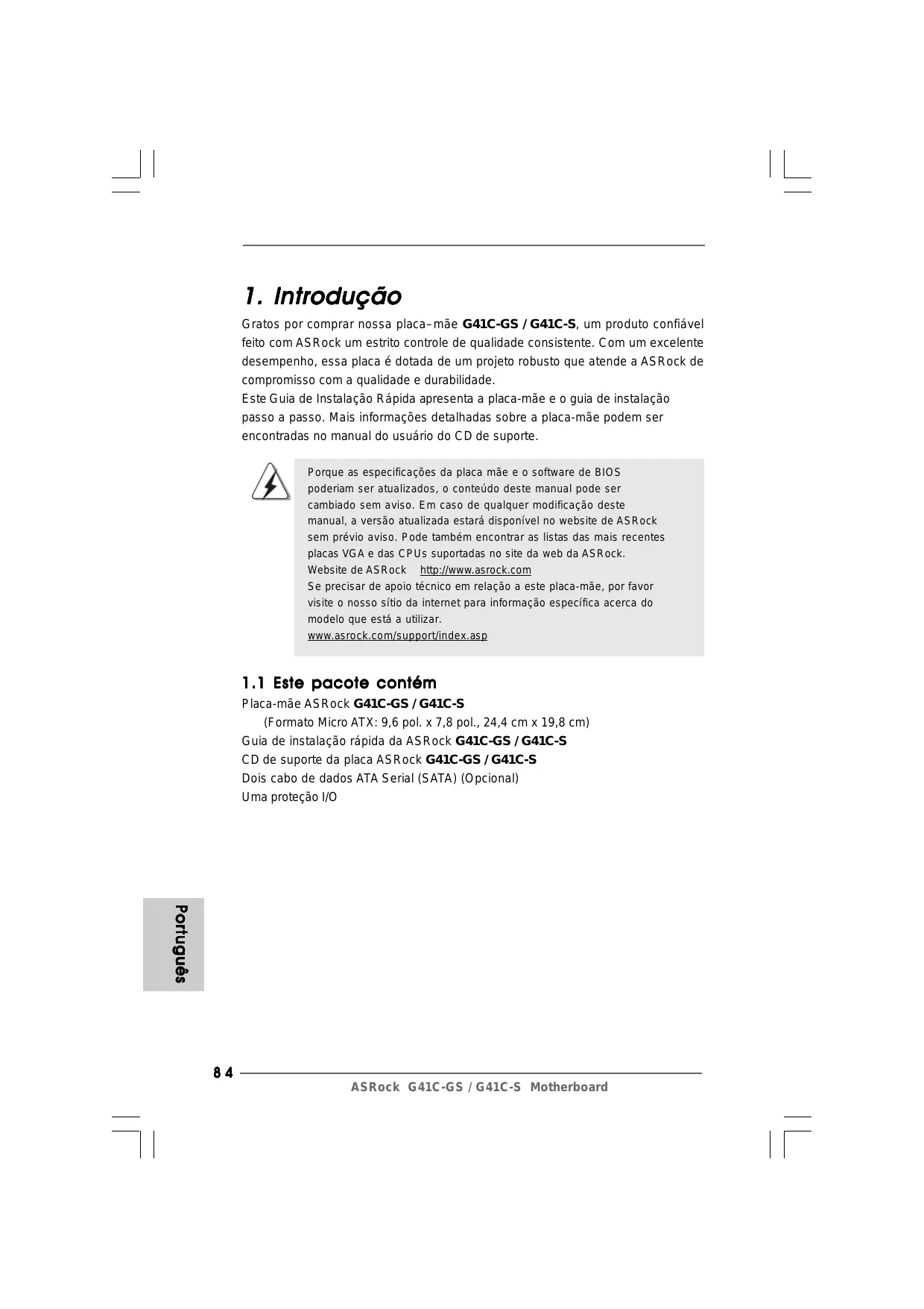 Gratos por comprar nossa placa–mãe G41C-GS / G41C-S, um produto confiável feito com ASRock um estrito controle de qualidade consistente. Com um excelente desempenho, essa placa é dotada de um projeto robusto que atende a ASRock de compromisso com a qualidade e durabilidade. Este Guia de Instalação Rápida apresenta a placa-mãe e o guia de instalação passo a passo. Mais informações detalhadas sobre a placa-mãe podem ser encontradas no manual do usuário do CD de suporte. Porque as especificações da placa mãe e o software de BIOS poderiam ser atualizados, o conteúdo deste manual pode ser cambiado sem aviso. Em caso de qualquer modificação deste manual, a versão atualizada estará disponível no website de ASRock sem prévio aviso. Pode também encontrar as listas das mais recentes placas VGA e das CPUs suportadas no site da web da ASRock. Website de ASRock http://www.asrock.com Se precisar de apoio técnico em relação a este placa-mãe, por favor visite o nosso sítio da internet para informação específica acerca do modelo que está a utilizar. www.asrock.com/support/index.asp