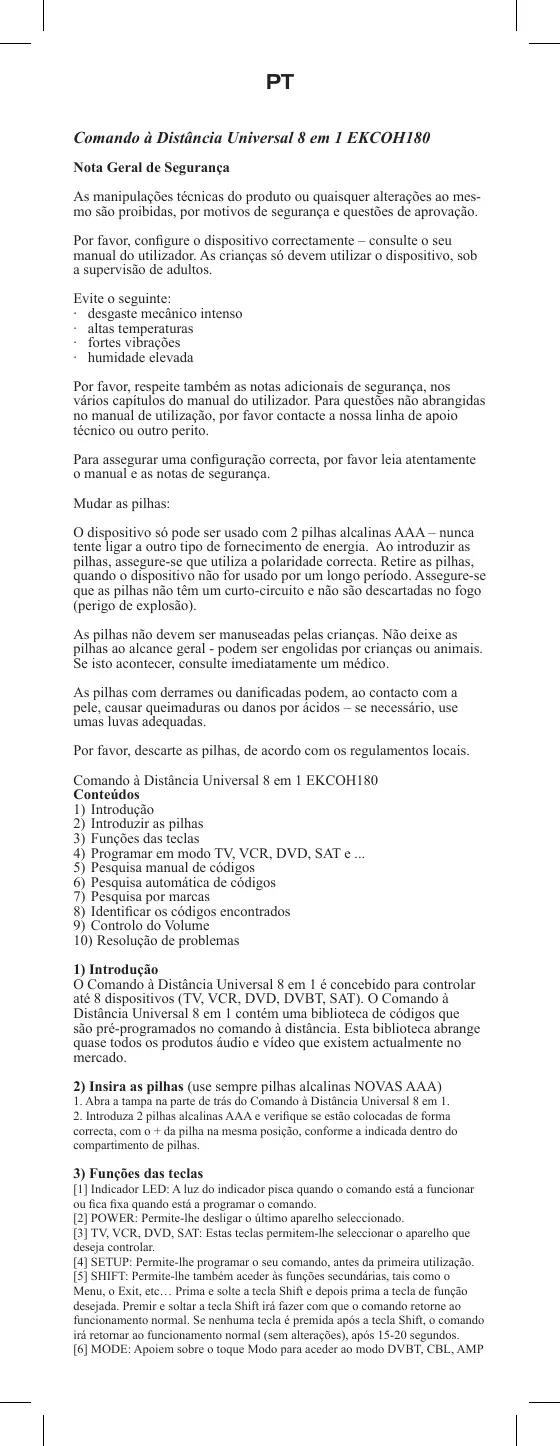 - humidade elevada Por favor, respeite também as notas adicionais de segurança, nos vários capítulos do manual do utilizador. Para questões não abrangidas no manual de utilização, por favor contacte a nossa linha de apoio técnico ou outro perito. Para assegurar uma configuração correcta, por favor leia atentamente o manual e as notas de segurança. Mudar as pilhas: O dispositivo só pode ser usado com 2 pilhas alcalinas AAA – nunca tente ligar a outro tipo de fornecimento de energia. Ao introduzir as pilhas, assegure-se que utiliza a polaridade correcta. Retire as pilhas, quando o dispositivo não for usado por um longo período. Assegure-se que as pilhas não têm um curto-circuito e não são descartadas no fogo (perigo de explosão). As pilhas não devem ser manuseadas pelas crianças. Não deixe as pilhas ao alcance geral - podem ser engolidas por crianças ou animais. Se isto acontecer, consulte imediatamente um médico. As pilhas com derrames ou danificadas podem, ao contacto com a pele, causar queimaduras ou danos por ácidos – se necessário, use umas luvas adequadas. Por favor, descarte as pilhas, de acordo com os regulamentos locais. Comando à Distância Universal 8 em 1 EKCOH180 Conteúdos