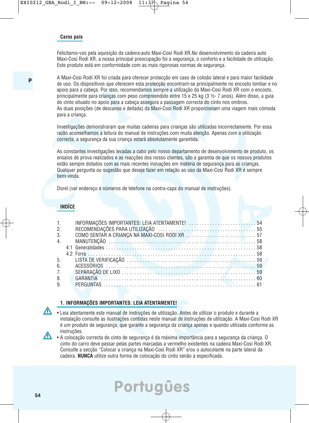 + Leia atentamente este manual de instruçües de utilizaçäo. Antes de utilizar o produto e durante à instalaçäo consulte as ilustragôes contidas neste manual de instruçôes de utilizaçgäo. À Maxi-Cosi Rodi XR é um produto de segurança, que garante a segurança da criança apenas e quando utilizada conforme as instrugôes.