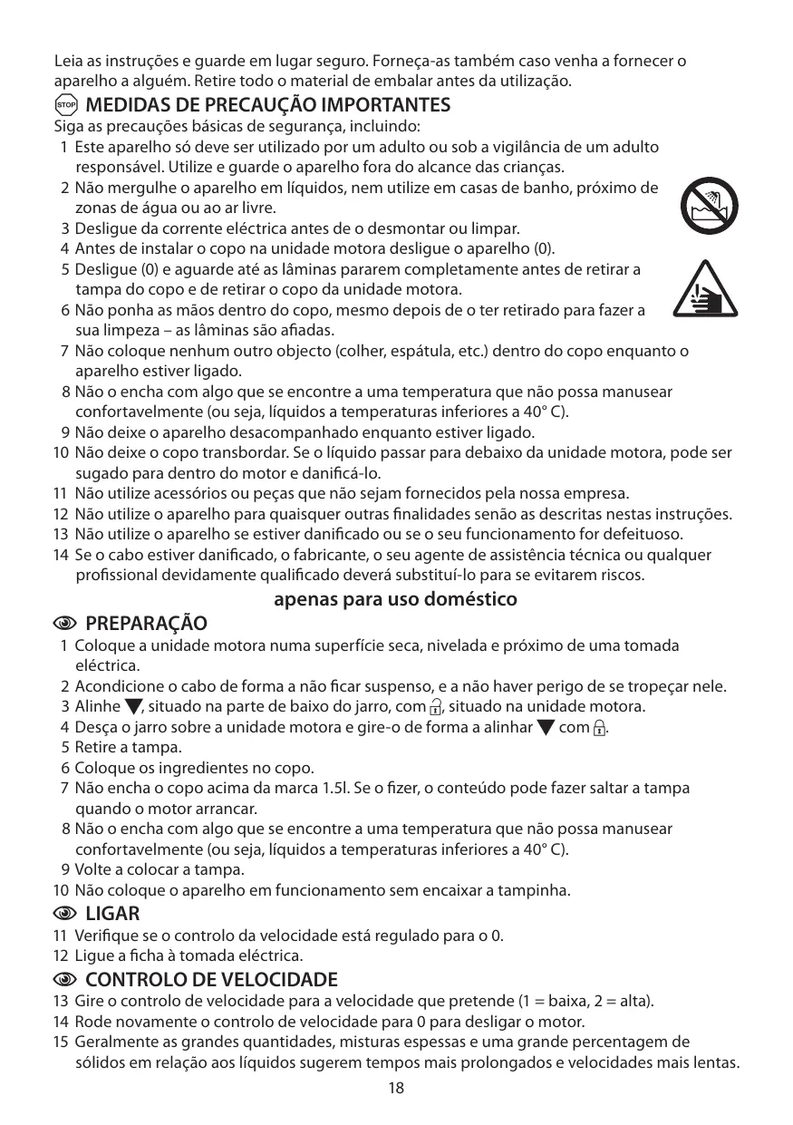 MEDIDAS DE PRECAUÇÀO IMPORTANTES Siga as precauçôes bäsicas de segurança, incluindo: 1 Este aparelho 56 deve ser utilizado por um adulto ou sob a vigiläncia de um adulto responsävel. Utilize e guarde o aparelho fora do alcance das crianças. 2 Näo mergulhe o aparelho em liquidos, nem utilize em casas de banho, préximo de zonas de ägua ou ao ar livre. 3 Desligue da corrente eléctrica antes de o desmontar ou limpar. 4 Antes de instalar o copo na unidade motora desligue o aparelho (0). 5 Desligue (0) e aguarde até as läminas pararem completamente antes de retirar a tampa do copo e de retirar o copo da unidade motora. 6 Näo ponha as mäos dentro do copo, mesmo depois de o ter retirado para fazer a sua limpeza - as lâminas säo afiadas. 7 Näo coloque nenhum outro objecto (colher, espätula, etc.) dentro do copo enquanto o aparelho estiver ligado. 8 Näo o encha com algo que se encontre a uma temperatura que näo possa manusear confortavelmente (ou seja, liquidos a temperaturas inferiores a 40° C). 9 Näo deixe o aparelho desacompanhado enquanto estiver ligado. 10 Näo deixe o copo transbordar. Se o liquido passar para debaixo da unidade motora, pode ser sugado para dentro do motor e danificä-lo. 11 No utilize acessérios ou peças que näo sejam fornecidos pela nossa empresa. 12 No utilize o aparelho para quaisquer outras finalidades senäo as descritas nestas instruçôes. 13 Nâo utilize o aparelho se estiver danificado ou se o seu funcionamento for defeituoso. 14 Se o cabo estiver danificado, o fabricante, o seu agente de assisténcia técnica ou qualquer profissional devidamente qualificado deveré substitui-lo para se evitarem riscos.