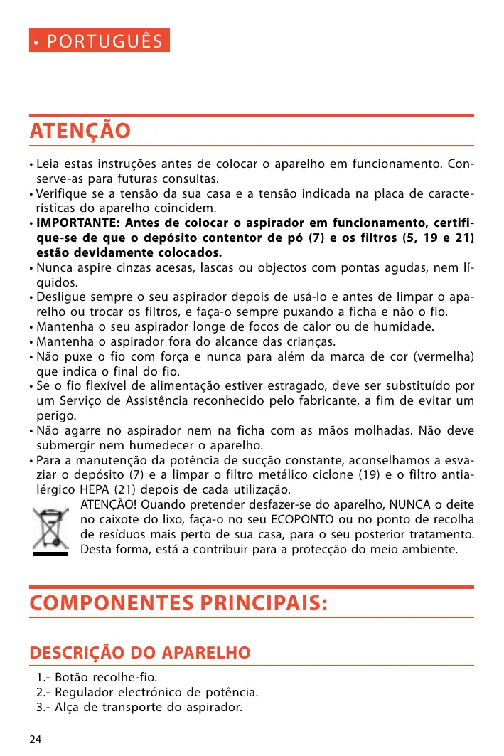PORT UËS ATENÇÂO + Leia estas instruçôes antes de colocar o aparelho em funcionamento. Con- serve-as para futuras consultas. +Verifique se a tensäo da sua casa e a tensäo indicada na placa de caracte- risticas do aparelho coincidem. +IMPORTANTE: Antes de colocar o aspirador em funcionamento, certi que-se de que o depésito contentor de pé (7) e os filtros (5, 19 e 21) estäo devidamente colocados. + Nunca aspire cinzas acesas, lascas ou objectos com pontas agudas, nem If- quidos. + Desligue sempre o seu aspirador depois de usé-lo e antes de limpar o apa- relho ou trocar os filtros, e faça-o sempre puxando à ficha e näo o fio. + Mantenha o seu aspirador longe de focos de calor ou de humidade. + Mantenha o aspirador fora do alcance das crianças. + Näo puxe o fio com força e nunca para além da marca de cor (vermelha) que indica o final do fio. +$e o fio flexivel de alimentaçäo estiver estragado, deve ser substituido por um Serviço de Assisténcia reconhecido pelo fabricante, à fim de evitar um perigo. + Näo agarre no aspirador nem na ficha com as mäos molhadas. Näo deve submergir nem humedecer 0 aparelho. Para a manutençäo da poténcia de sucçäo constante, aconselhamos a esva- Ziar o depésito (7) e a limpar o filtro metälico ciclone (19) e o filtro antia- lérgico HEPA (21) depois de cada utilizaçäo. ATENÇAO! Quando pretender desfazer-se do aparelho, NUNCA o deite NY no caixote do lixo, faça-o no seu ECOPONTO ou no ponto de recolha de residuos mais perto de sua casa, para o seu posterior tratamento. Desta forma, esté a contribuir para a protecçäo do meio ambiente. COMPONENTES PRINCIPAIS: