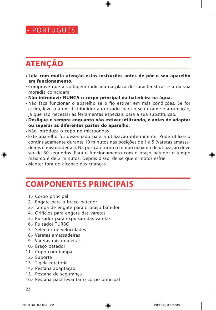 KO] + PORTUGUËS ATENÇÂO +Leia com muita atençäo estas instruçôes antes de pôr o seu aparelho em funcionamento. + Comprove que a voltagem indicada na placa de caracteristicas e a da sua moradia coincidem. + Näo introduzir NUNCA o corpo principal da batedeira na ägua. + Näo faça funcionar o aparelho se o fio estiver em mäs condiçées. Se for assim, leve-o a um distribuidor autorizado, para o seu exame e arrumaçäo, jé que säo necessérias ferramentas especiais para a sua substituiçäo. + Desligue-o sempre enquanto näo estiver utilizando, e antes de adaptar ou separar as diferentes partes do aparelho. + Näo introduza o copo no microondas «Este aparelho foi desenhado para a utilizaçäo intermitente. Pode utilizä-lo continuadamente durante 10 minutos nas posiçôes de 1 a 5 (varetas amassa- deiras e misturadeiras). Na posiçäo turbo o tempo mäâximo de utilizaçäo deve ser de 30 segundos. Para o funcionamento com o braço batedor 0 tempo méximo é de 2 minutos. Depois disso, deixe que o motor esfrie. + Manter fora do alcance das crianças. COMPONENTES PRINCIPAIS 12 Corpo principal