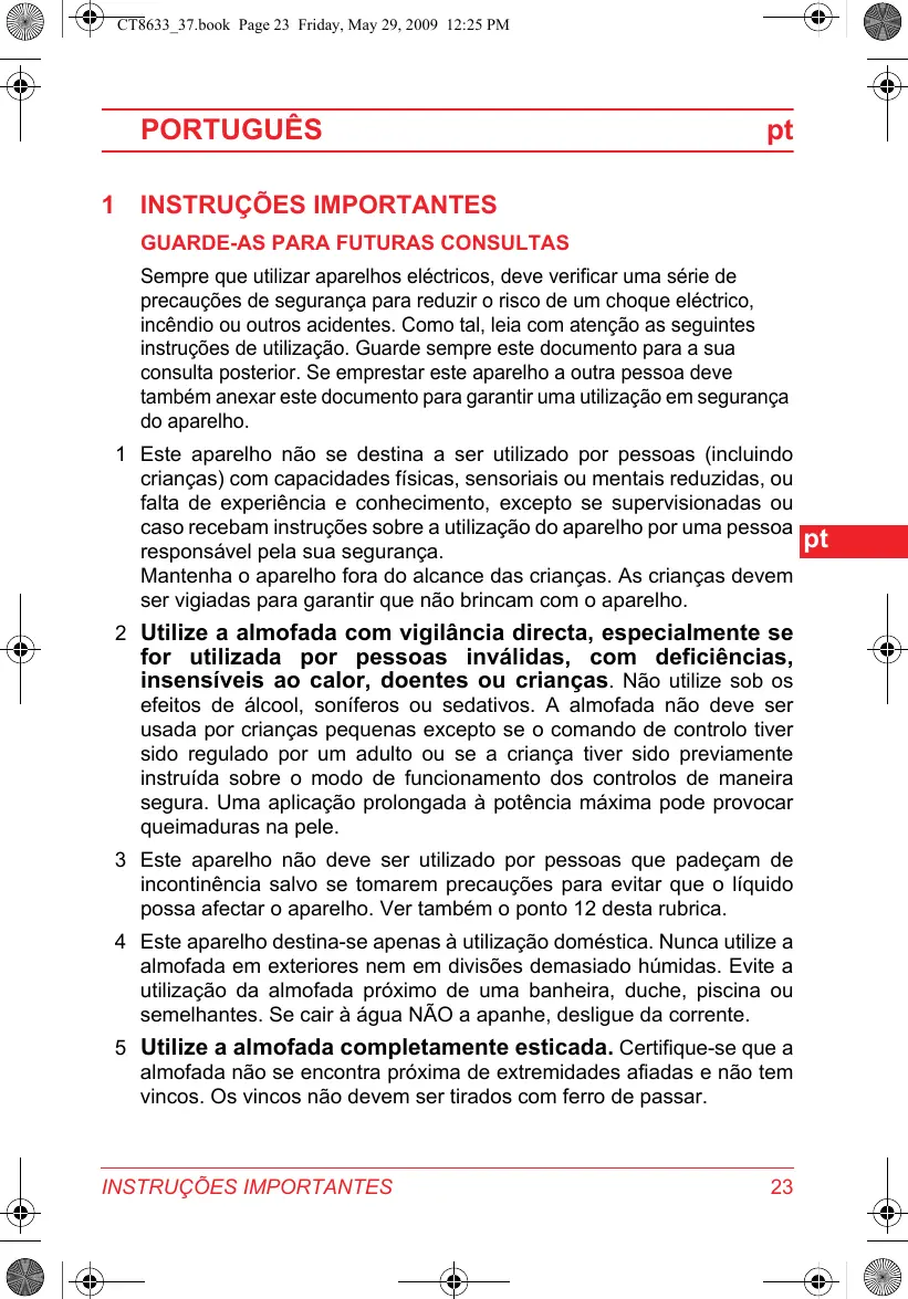 2 Utilize aomalofada com vigilancia directa,especiallyme se forutilizadora por pessoas invalidas,comdeficiencias, insensitiveaisao calor,doentesoucrianças.Naoutilizessobos efeitosdealcool,soniferosousedativos.Amalofada naodeveser usada porcriançaspequenasexcepto se ocommandode controlo tiver sido regulado porumadultouseacrianza tiver sido previamente instruirdsobreomodo defunacionamento dos controlosde maneira segura.Uma aplicacao prolongadaatotenciamaxima podeprovocar queimadurasnapele.