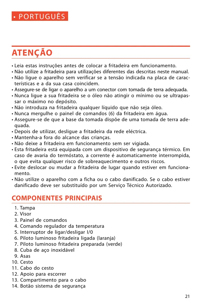ATENÇÂO - Leia estas instruçôes antes de colocar a fritadeira em funcionamento. + Näo utilize a fritadeira para utilizaçôes diferentes das descritas neste manual. + Näo ligue o aparelho sem verificar se a tensäo indicada na placa de carac- teristicas e a da sua casa coincidem. + Assegure-se de ligar o aparelho a um conector com tomada de terra adequada. + Nunea ligue a sua fritadeira se o éleo nâo atingir o minimo ou se ultrapas- sar o méximo no depésito. + Néo introduza na fritadeira qualquer liquido que näo seja éleo. + Nunca mergulhe o painel de comandos (6) da fritadeira em âgua. + Assegure-se de que a base da tomada dispôe de uma tomada de terra ade- quada. + Depois de utilizar, desligue a fritadeira da rede eléctrica. + Mantenha-a fora do alcance das crianças. + Näo deixe a fritadeira em funcionamento sem ser vigiada. - Esta fritadeira est equipada com um dispositivo de segurança térmico. Em caso de avaria do termôstato, a corrente é automaticamente interrompida, © que evita qualquer risco de sobreaquecimento e outros riscos. - Evite deslocar ou mudar a fritadeira de lugar quando estiver em funciona- mento. + Näo utilize o aparelho com a ficha ou o cabo danificado. Se o cabo estiver danificado deve ser substituido por um Serviço Técnico Autorizado. COMPONENTES PRINCIPAIS