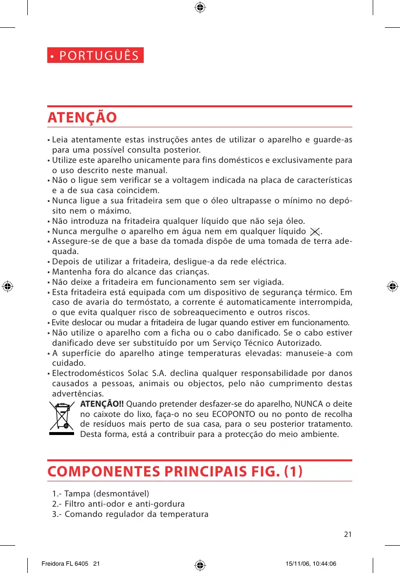 PORTUGUES ATENÇÂO + Leia atentamente estas instruçôes antes de utilizar o aparelho e guarde-as para uma possivel consulta posterior. + Utilize este aparelho unicamente para fins domésticos e exclusivamente para © uso descrito neste manual. + Näo o ligue sem verificar se a voltagem indicada na placa de caracteristicas € à de sua casa coincidem. + Nunca ligue a sua fritadeira sem que o leo ultrapasse o minimo no depé- sito nem o mäximo. + No introduza na fritadeira qualquer liquido que näo seja éleo. + Nunca mergulhe o aparelho em âgua nem em qualquer liquido X. + Assegure-se de que a base da tomada dispôe de uma tomada de terra ade- quada. + Depois de utilizar a fritadeira, desligue-a da rede eléctrica. + Mantenha fora do alcance das crianças. - Näo deixe a fritadeira em funcionamento sem ser vigiada. + Esta fritadeira esté equipada com um dispositivo de segurança térmico. Em caso de avaria do terméstato, a corrente é automaticamente interrompida, o que evita qualquer risco de sobreaquecimento e outros riscos. + Evite deslocar ou mudar a fritadeira de lugar quando estiver em funcionamento. + Näo utilize o aparelho com a ficha ou o cabo danificado. Se o cabo estiver danificado deve ser substituido por um Serviço Técnico Autorizado. + A superficie do aparelho atinge temperaturas elevadas: manuseie-a com cuidado. - Electrodomésticos Solac S.A. declina qualquer responsabilidade por danos causados a pessoas, animais ou objectos, pelo näo cumprimento destas adverténcias. ATENÇAO! Quando pretender desfazer-se do aparelho, NUNCA o deite no caixote do lixo, faça-o no seu ECOPONTO ou no ponto de recolha de residuos mais perto de sua casa, para o seu posterior tratamento. — Desta forma, esté a contribuir para a protecçäo do meio ambiente. COMPONENTES PRINCIPAIS FIG. (1) 1.- Tampa (desmontävel)