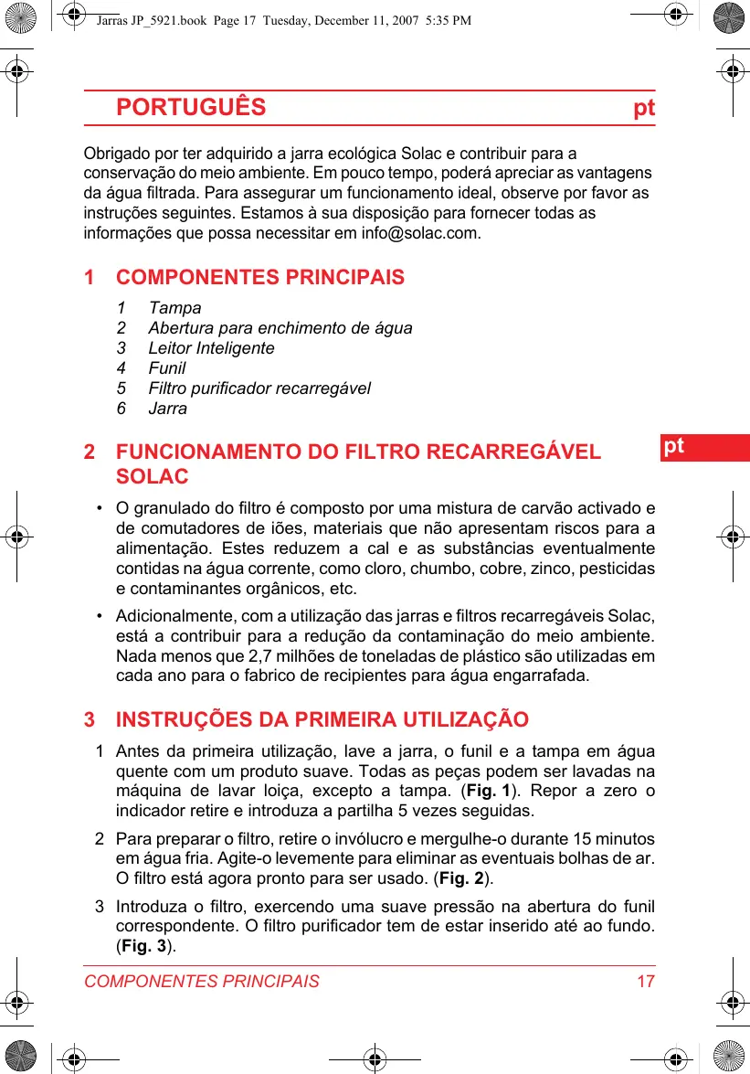 Obrigado por ter adquirido a jarra ecologica Solac e contribuir para a conservação do meio ambiente. Em pouco tempo, poderá avalgar as vantagens da água filtrada. Para assegurar um functimento ideal, observe por favor as instruções seguides. Estamos à sua disposicao para fazercer todas as informacoes que possa necessitar em info@solac.com.
