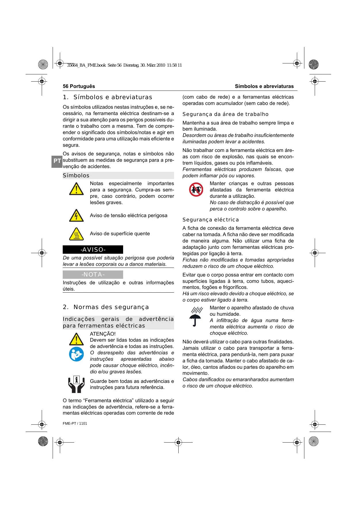 Os símbolos utilizados nestas instruções e, se necessário, na ferramenta eléctrica destinam-se a dirigir a sua atenção para os perigos possíveis durante o trabalho com a mesma. Tem de compreender o significado dos símbolos/notas e agir em conformidade para uma utilização mais eficiente e segura. Os avisos de segurança, notas e símbolos não PT substituem as medidas de segurança para a prevenção de acidentes. Símbolos Notas especialmente importantes para a segurança. Cumpra-as sempre, caso contrário, podem ocorrer lesões graves. Aviso de tensão eléctrica perigosa Aviso de superfície quente -AVISODe uma possível situação perigosa que poderia levar a lesões corporais ou a danos materiais. -NOTAInstruções de utilização e outras informações úteis.
