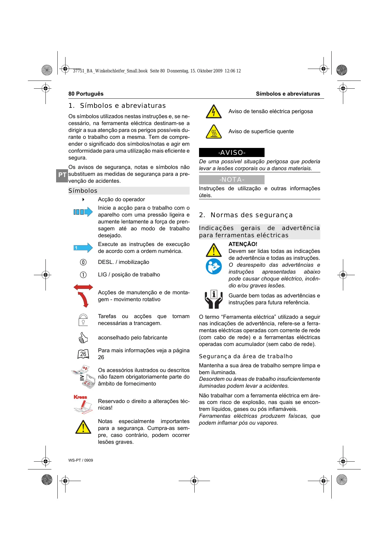 Segurança da área de trabalho Os acessórios ilustrados ou descritos não fazem obrigatoriamente parte do âmbito de fornecimento Mantenha a sua área de trabalho sempre limpa e bem iluminada. Desordem ou áreas de trabalho insuficientemente iluminadas podem levar a acidentes. Reservado o direito a alterações técnicas! Notas especialmente importantes para a segurança. Cumpra-as sempre, caso contrário, podem ocorrer lesões graves. WS-PT / 0909 Aviso de superfície quente Instruções de utilização e outras informações úteis. Símbolos