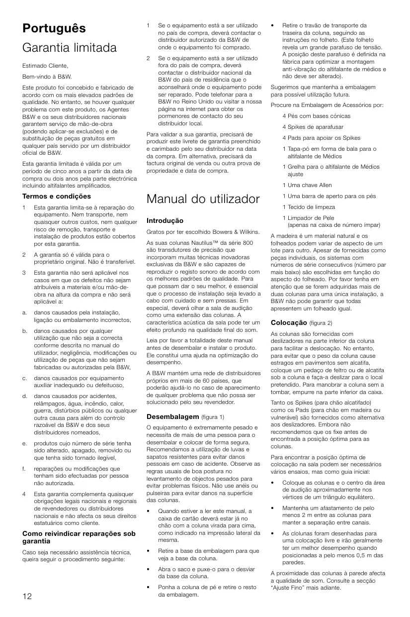 Retire o travão de transporte da traseira da coluna, seguindo as instruções no folheto. (Este folheto revela um grande parafuso de tensão. A posição deste parafuso é definida na fábrica para optimizar a montagem anti-vibração do altifalante de médios e não deve ser alterado). Sugerimos que mantenha a embalagem para possível utilização futura. Procure na Embalagem de Acessórios por: 4 Pés com bases cónicas 4 Spikes de aparafusar Para validar a sua garantia, precisará de produzir este livrete de garantia preenchido e carimbado pelo seu distribuidor na data da compra. Em alternativa, precisará da factura original de venda ou outra prova de propriedade e data de compra. 4 Pads para apoiar os Spikes 1 Tapa-pó em forma de bala para o altifalante de Médios 1 Grelha para o altifalante de Médios ajuste 1 Uma chave Allen Manual do utilizador 1 Uma barra de aperto para os pés Introdução 1 Limpador de Pele (apenas na caixa de número ímpar) Gratos por ter escolhido Bowers & Wilkins. As suas colunas Nautilus™ da série 800 são transdutores de precisão que incorporam muitas técnicas inovadoras exclusivas da B&W e são capazes de reproduzir o registo sonoro de acordo com os melhores padrões de qualidade. Para que possam dar o seu melhor, é essencial que o processo de instalação seja levado a cabo com cuidado e sem pressas. Em especial, deverá olhar a sala de audição como uma extensão das colunas. A característica acústica da sala pode ter um efeito profundo na qualidade final do som. Leia por favor a totalidade deste manual antes de desembalar e instalar o produto. Ele constitui uma ajuda na optimização do desempenho. A B&W mantém uma rede de distribuidores próprios em mais de 60 países, que poderão ajudá-lo no caso de aparecimento de qualquer problema que não possa ser solucionado pelo seu revendedor. Desembalagem (figura 1) O equipamento é extremamente pesado e necessita de mais de uma pessoa para o desembalar e colocar de forma segura. Recomendamos a utilização de luvas e sapatos resistentes para evitar danos pessoais em caso de acidente. Observe as regras usuais de boa postura no levantamento de objectos pesados para evitar problemas físicos. Não use anéis ou pulseiras para evitar danos na superfície das colunas.