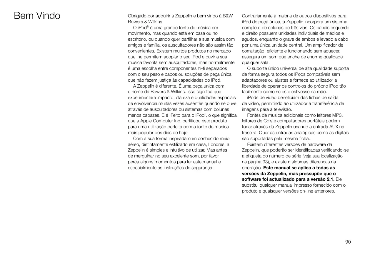 Bem Vindo Obrigado por adquirir a Zeppelin e bem vindo à B&W Bowers & Wilkins. O iPod® é uma grande fonte de música em movimento, mas quando está em casa ou no escritório, ou quando quer partilhar a sua musica com amigos e família, os auscultadores não são assim tão convenientes. Existem muitos produtos no mercado que lhe permitem acoplar o seu iPod e ouvir a sua musica favorita sem auscultadores, mas normalmente é uma escolha entre componentes hi-fi separados com o seu peso e cabos ou soluções de peça única que não fazem justiça às capacidades do iPod. A Zeppelin é diferente. É uma peça única com o nome da Bowers & Wilkins. Isso significa que experimentará impacto, clareza e qualidades espaciais de envolvência muitas vezes ausentes quando se ouve através de auscultadores ou sistemas com colunas menos capazes. E é ‘Feito para o iPod’, o que significa que a Apple Computer Inc. certificou este produto para uma utilização perfeita com a fonte de musica mais popular dos dias de hoje. Com a sua forma inspirada num conhecido meio aéreo, distintamente estilizado em casa, Londres, a Zeppelin é simples e intuitivo de utilizar. Mas antes de mergulhar no seu excelente som, por favor perca alguns momentos para ler este manual e especialmente as instruções de segurança. Contrariamente à maioria de outros dispositivos para iPod de peça única, a Zeppelin incorpora um sistema completo de colunas de três vias. Os canais esquerdo e direito possuem unidades individuais de médios e agudos, enquanto o grave de ambos é levado a cabo por uma única unidade central. Um amplificador de comutação, eficiente e funcionando sem aquecer, assegura um som que enche de enorme qualidade qualquer sala. O suporte único universal de alta qualidade suporta de forma segura todos os iPods compatíveis sem adaptadores ou ajustes e fornece ao utilizador a liberdade de operar os controlos do próprio iPod tão facilmente como se este estivesse na mão. iPods de vídeo beneficiam das fichas de saída de vídeo, permitindo ao utilizador a transferência de imagens para a televisão. Fontes de musica adicionais como leitores MP3, leitores de Cd’s e computadores portáteis podem tocar através da Zeppelin usando a entrada AUX na traseira. Quer as entradas analógicas como as digitais são suportadas pela mesma ficha. Existem diferentes versões de hardware da Zeppelin, que poderão ser identificadas verificando-se a etiqueta do número de série (veja sua localização na página 93), e existem algumas diferenças na operação. Este manual se aplica a todas as versões da Zeppelin, mas pressupõe que o software foi actualizado para a versão 2.1. Ele substitui qualquer manual impresso fornecido com o produto e quaisquer versões on-line anteriores.