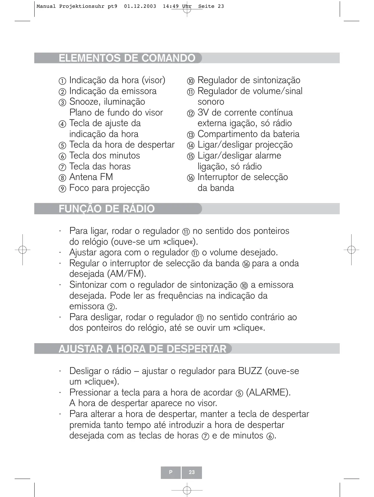Ao acontear umaunjica vez a tecla Snooze ③ activa por aprox. 10 segundos a iluminação do visor e a projecção da hora.
