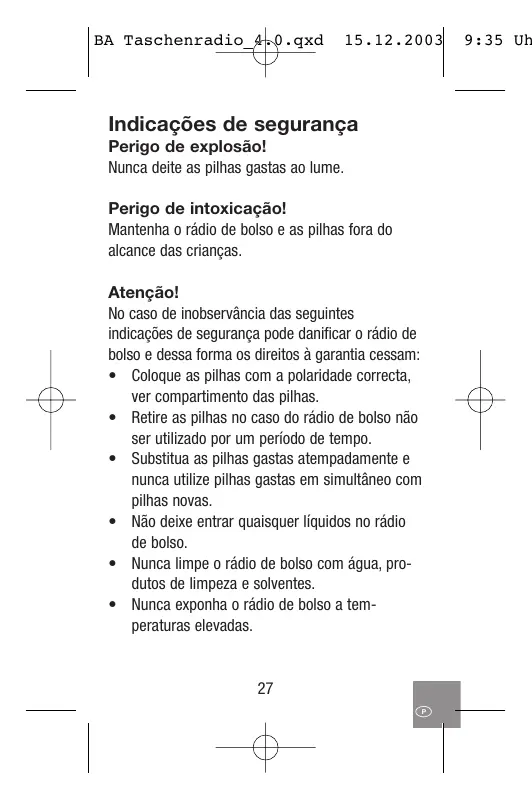 Mantenha o rádio de bolso e as pilhas fora do alcance dascriçças.