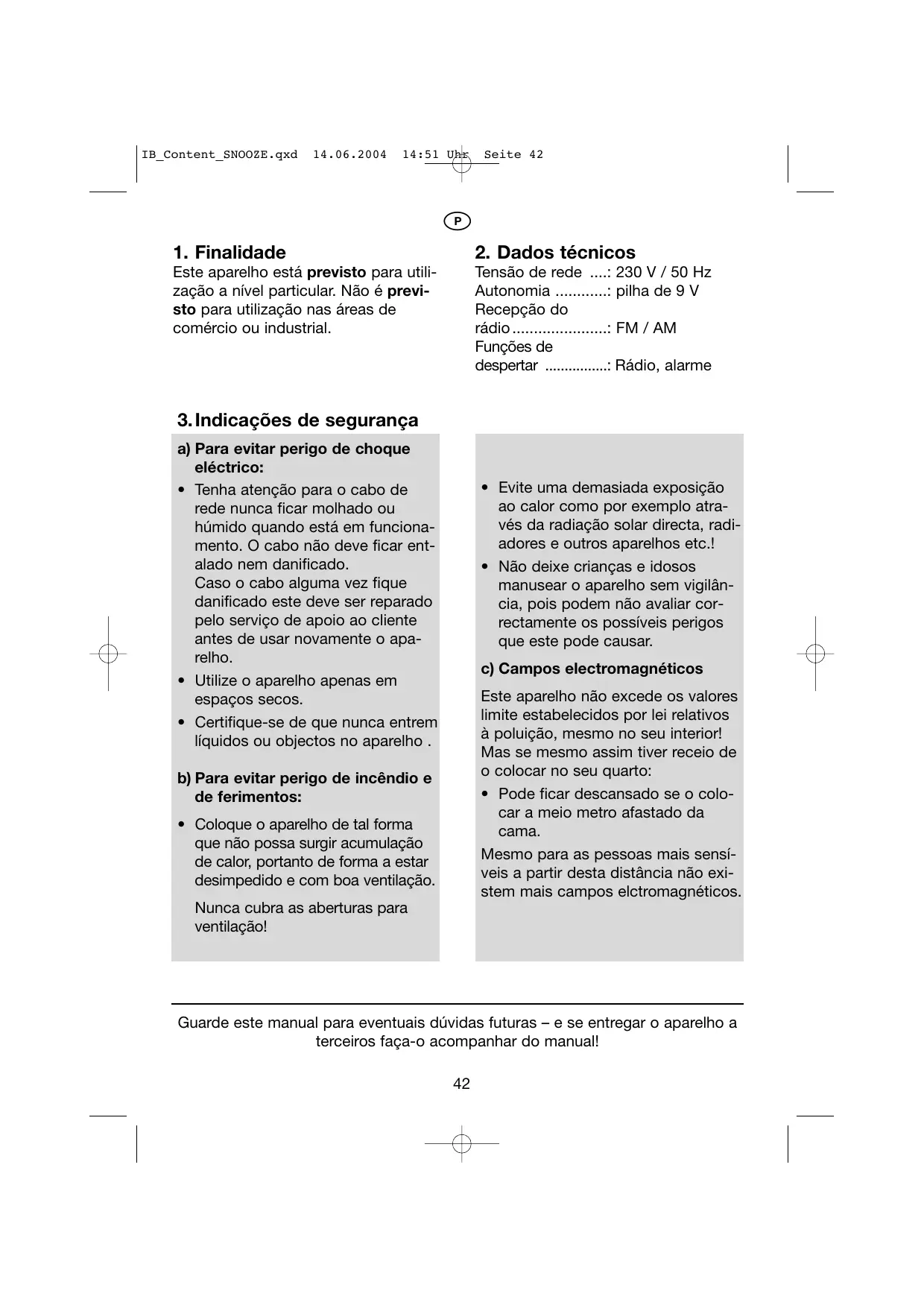 Tensäo de rede …..: 230 V / 50 Hz Autonomia . : pilha de 9 V Recepçäo do rädio : FM / AM Funçôes de despertar …… .: Rädio, alarme -_Evite uma demasiada exposiçäo ao calor como por exemplo atra- vés da radiaçäo solar directa, radi- adores e outros aparelhos etc.! + _Näo deixe crianças e idosos manusear o aparelho sem vigilän- cia, pois podem näo avaliar cor- rectamente os possiveis perigos que este pode causar. c) Campos electromagnéticos Este aparelho näo excede os valores limite estabelecidos por lei relativos à poluiçäo, mesmo no seu interior! Mas se mesmo assim tiver receio de o colocar no seu quarto: + Pode ficar descansado se o colo- car a meio metro afastado da cama. Mesmo para as pessoas mais sensi- veis a partir desta distância näo exi- stem mais campos elctromagnéticos. Guarde este manual para eventuais düvidas futuras — e se entregar o aparelho a terceiros faça-o acompanhar do manual!