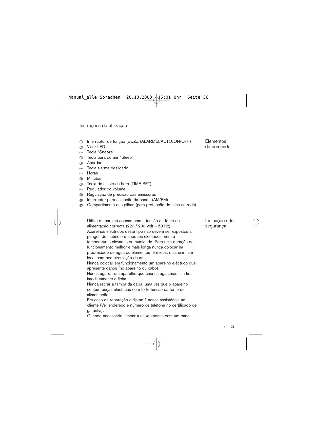Interruptor de função (BUZZ (ALARME)/AUTO/ON/OFF) Visor LED Tecla "Snooze" Tecla para dormir "Sleep" Acordar Tecla alarme desligado Horas Minutos Tecla de ajuste da hora (TIME SET) Regulador do volume Regulação de precisão das emissoras Interruptor para selecção da banda (AM/FM) Compartimento das pilhas (para protecção de falha na rede) Elementos de comando Utilize o aparelho apenas com a tensão da fonte de alimentação correcta (220 / 230 Volt ~ 50 Hz). Aparelhos eléctricos deste tipo não devem ser expostos a perigos de incêndio e choques eléctricos, nem a temperaturas elevadas ou humidade. Para uma duração de funcionamento melhor e mais longa nunca colocar na proximidade de água ou elementos térmicos, mas sim num local com boa circulação de ar. Nunca colocar em funcionamento um aparelho eléctrico que apresente danos (no aparelho ou cabo). Nunca agarrar um aparelho que caiu na àgua,mas sim tirar imediatamente a ficha. Nunca retirar a tampa da caixa, uma vez que o aparelho contém peças eléctricas com forte tensão da fonte de alimentação. Em caso de reparação dirija-se à nossa assistência ao cliente (Ver endereço e número de telefone no certificado de garantia). Quando necessário, limpar a caixa apenas com um pano Indicações de segurança