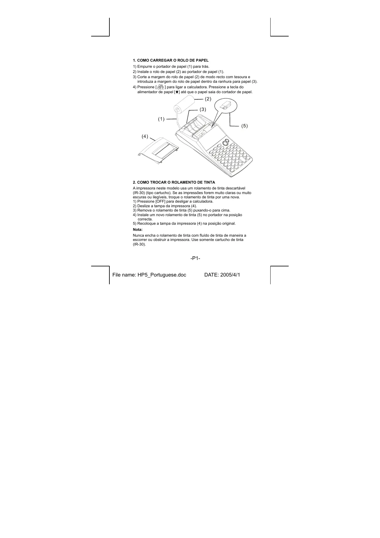 A impressora neste modelo usa um rolamento de tinta descartävel {IR-30) (üpo cartucho). Se as impressôes forem muito claras ou muito escuras ou ilegiveis, roque o ralamento de tinta por uma nova.