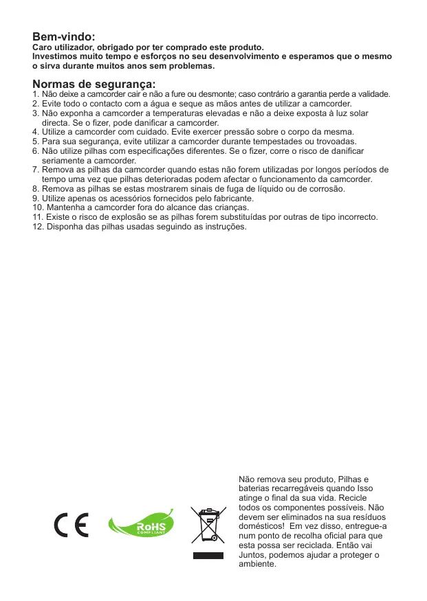1. Não deixe a camcorder cair e não a fure ou desmonte; caso contrário a garantia perde a validade. 2. Evite todo o contacto com a água e seque as mãos antes de utilizar a camcorder. 3. Não exponha a camcorder a temperaturas elevadas e não a deixe exposta à luz solar directa. Se o fizer, pode danificar a camcorder. 4. Utilize a camcorder com cuidado. Evite exercer pressão sobre o corpo da mesma. 5. Para sua segurança, evite utilizar a camcorder durante tempestades ou trovoadas. 6. Não utilize pilhas com especificações diferentes. Se o fizer, corre o risco de danificar seriamente a camcorder. 7. Remova as pilhas da camcorder quando estas não forem utilizadas por longos períodos de tempo uma vez que pilhas deterioradas podem afectar o funcionamento da camcorder. 8. Remova as pilhas se estas mostrarem sinais de fuga de líquido ou de corrosão. 9. Utilize apenas os acessórios fornecidos pelo fabricante. 10. Mantenha a camcorder fora do alcance das crianças. 11. Existe o risco de explosão se as pilhas forem substituídas por outras de tipo incorrecto. 12. Disponha das pilhas usadas seguindo as instruções.