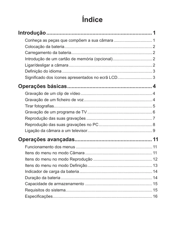 Operaçôes avançadas.. Funcionamento dos menus ltens do menu no modo Câmara . ltens do menu no modo Reproduçäo ltens do menu no modo Definiçäo Indicador de carga da bateria… Duraçäo da bateria… Capacidade de armazenamento . Requisitos do sistema. Especificaçües.
