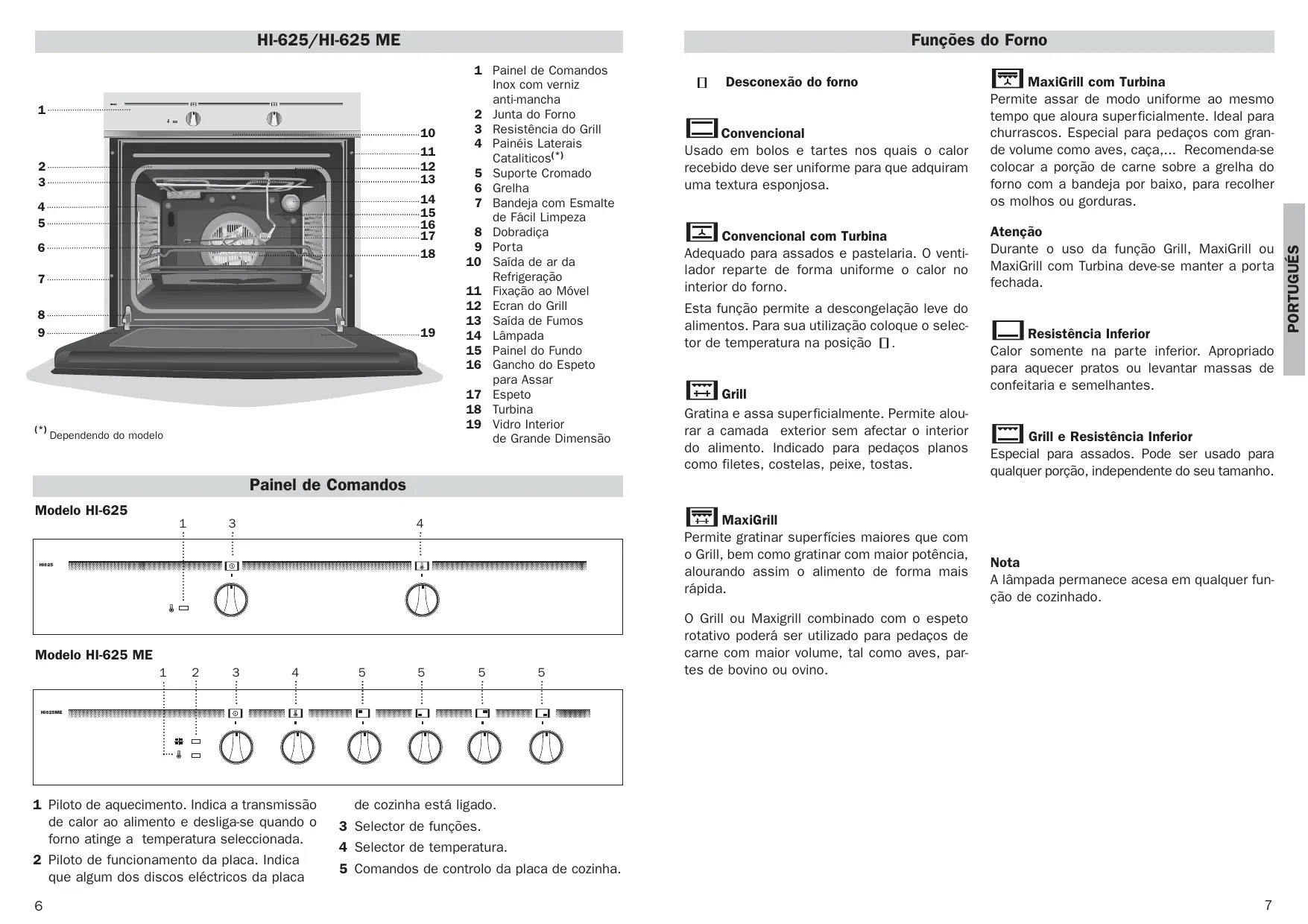 Funçôes do Forno [ Desconexäo do forno EI Convencional Usado em bolos e tartes nos quais o calor recebido deve ser uniforme para que adquiram uma textura esponjosa. Convencional com Turbina Adequado para assados e pastelaria. O venti- lador reparte de forma uniforme o calor no interior do forno. Esta funçäo permite a descongelaçäo leve do alimentos. Para sua utilizaçäo coloque o selec- tor de temperatura na posiçäo [. Grill Gratina e assa superficialmente. Permite alou- rar a camada exterior sem afectar o interior do alimento. Indicado para pedaços planos como filetes, costelas, peixe, tostas. MaxiGrill Permite gratinar superficies maiores que com o© Grill, bem como gratinar com maior poténcia, alourando assim o alimento de forma mais râpida. © Grill ou Maxigrill combinado com o espeto rotativo poderä ser utilizado para pedaços de carne com maior volume, tal como aves, par- tes de bovino ou ovino. MaxiGrill com Turbina Permite assar de modo uniforme ao mesmo tempo que aloura superficialmente. Ideal para churrascos. Especial para pedaços com gran- de volume como aves, caça,.… Recomenda-se colocar a porçäo de carne sobre a grelha do forno com a bandeja por baixo, para recolher os molhos ou gorduras. Atençäo Durante o uso da funçäo Grill, MaxiGrill ou MaxiGrill com Turbina deve-se manter a porta fechada. = | Resisténcia Inferior Calor somente na parte inferior. Apropriado para aquecer pratos ou levantar massas de confeitaria e semelhantes. El Grill e Resisténcia Inferior Especial para assados. Pode ser usado para qualquer porçäo, independente do seu tamanho. Nota A lâmpada permanece acesa em qualquer fun- çäo de cozinhado. PORTUGUÉS