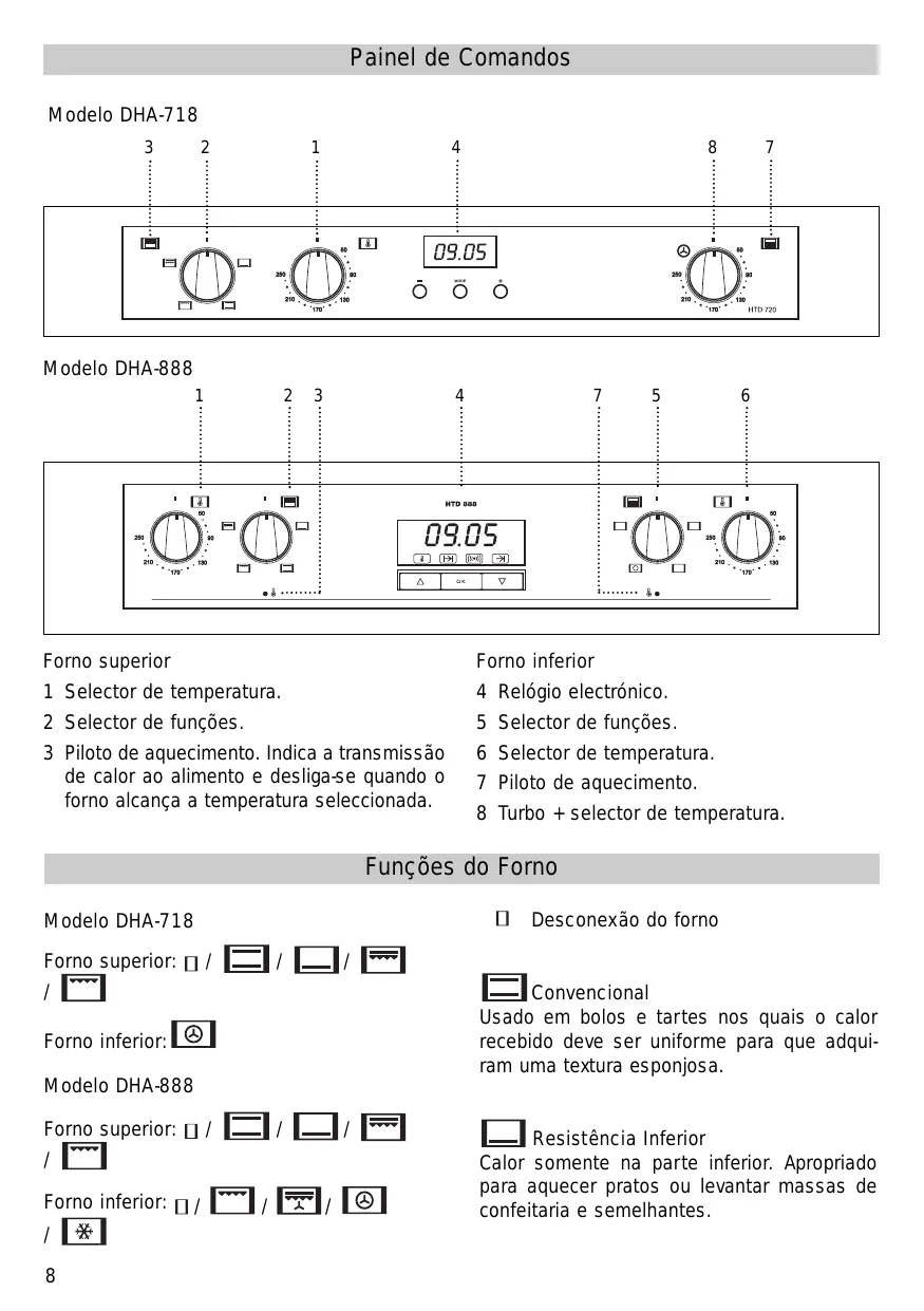 7 Piloto de aquecimento. 8 Turbo + selector de temperatura. Funções do Forno Desconexão do forno Modelo DHA-718 Forno superior: